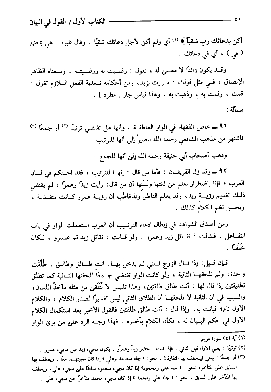 91- خاض الفقهاء في الواو العاطفة وأنها هل تقتضي ترتيبا2 أو جمعا3 فاشتهر من مذهب الشافعي رحمه الله المصير إلى أنها للترتيب.