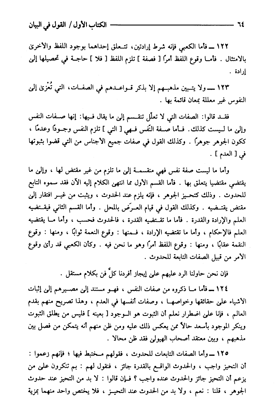 123- ولا يتبين مذهبهم إلا بذكر قواعدهم في الصفات التي تعزى إلى النفوس غير معلله بمعان قائمة بها.