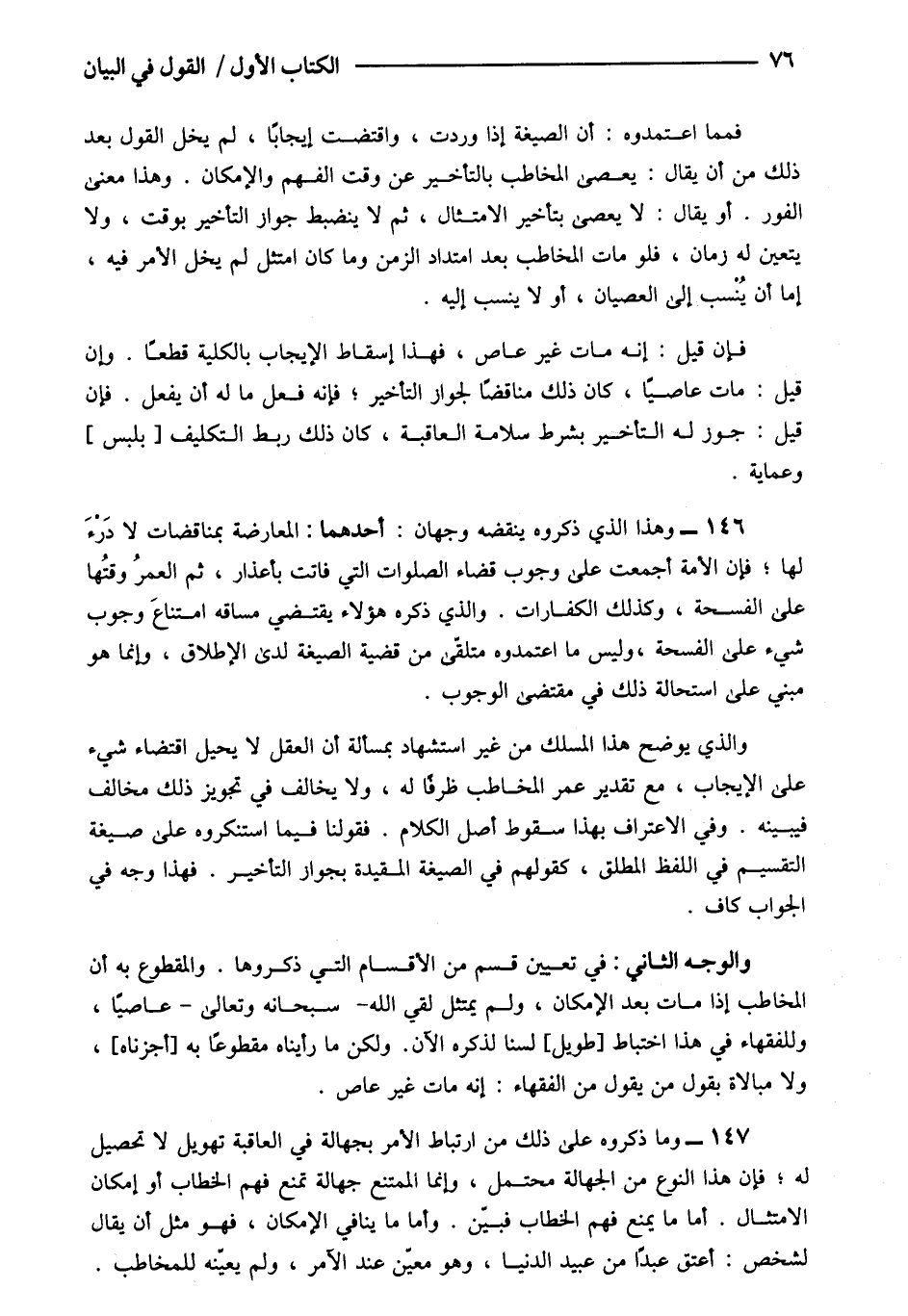 والوجه الثاني: في تعيين قسم من الأقسام التي ذكروها والمقطوع به أن المخاطب إذا مات بعد الإمكان ولم يمتثل لقى الله سبحانه وتعالى: عاصيا وللفقهاء في هذا اختباط [طويل] لسنا لذكره الآن ولكن ما رأيناه مقطوعا به [أجزناه] ولا مبالاة بقول من يقول من الفقهاء إنه مات غير عاص.