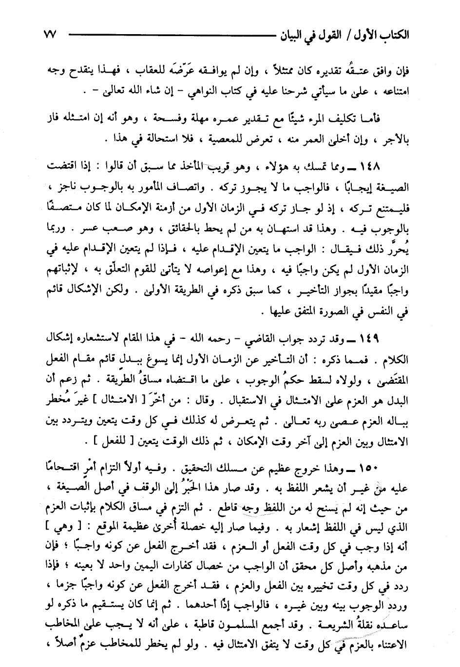 148- ومما تمسك به هؤلاء وهو قريب المأخذ مما سبق أن قالوا إذا اقتضت الصيغة إيجابا فالواجب ما لا يجوز تركه واتصاف المأمور به بالوجوب ناجز فليمتنع تركه إذ لو جاز تركه في الزمان الأول من أزمنة الإمكان لما كان متصفا بالوجوب فيه وهذا قد استهان به من لم يحط بالحقائق وهو صعب عسر وربما يحرر ذلك فيقال الواجب ما يتعين الإقدام عليه فإذا لم يتعين الإقدام عليه في الزمان الأول لم يكن واجبا فيه وهذا مع إعواصه لا يتأتى للقوم التعلق به لإثباتهم واجبا مقيدا بجواز التأخير كما سبق ذكره في الطريقة الأولى ولكن الإشكال قائم في النفس في الصورة المتفق عليها.