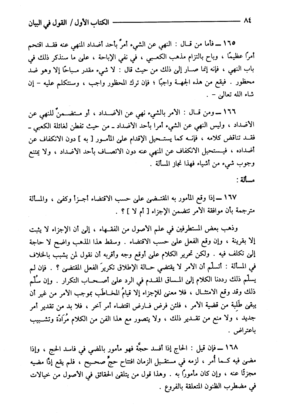168- فإن قيل الحاج إذا أفسد حجة فهو مأمور بالمضي في فاسد الحج وإذا مضى فيه كما أمر لزمه في مستقبل الزمان افتتاح حج صحيح فلم يقع إذا مضيه مجزئا عنه وإن كان مأمورا به وهذا قول من يتلقى الحقائق في الأصول من خيالات في مضطرب الظنون المتعلقة بالفروع.