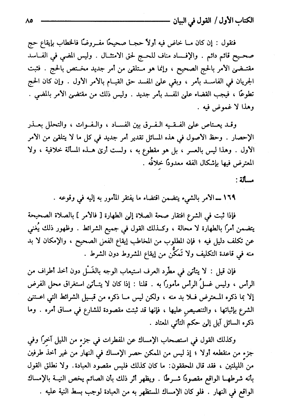 169- الأمر بالشيء يتضمن اقتضاء ما يفتقر المأمور به إليه في وقوعه فإذا ثبت في الشرع افتقار صحة الصلاة إلى الطهارة فالأمر بالصلاة الصحيحة يتضمن أمرا بالطهارة لا محالة وكذلك القول في جميع الشرائط وظهور ذلك يغني عن تكلف دليل فيه فإن المطلوب من المخاطب إيقاع الفعل الصحيح والإمكان لا بد منه في قاعدة التكليف ولا تمكن من إيقاع المشروط دون الشرط.