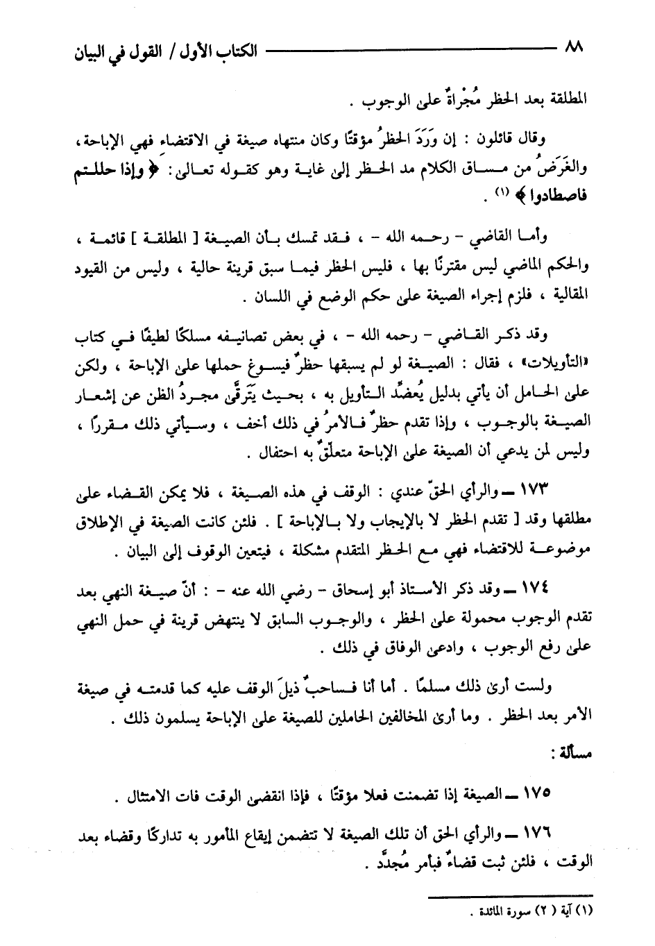 173- والرأي الحق عندي الوقف في هذه الصيغة فلا يمكن القضاء على مطلقها وقد [تقدم الحظر لا بالإيجاب ولا بالإباحة] فلئن كانت الصيغة في الإطلاق موضوعة للاقتضاء فهي مع الحظر المتقدم مشكلة فيتعين الوقوف إلى البيان.