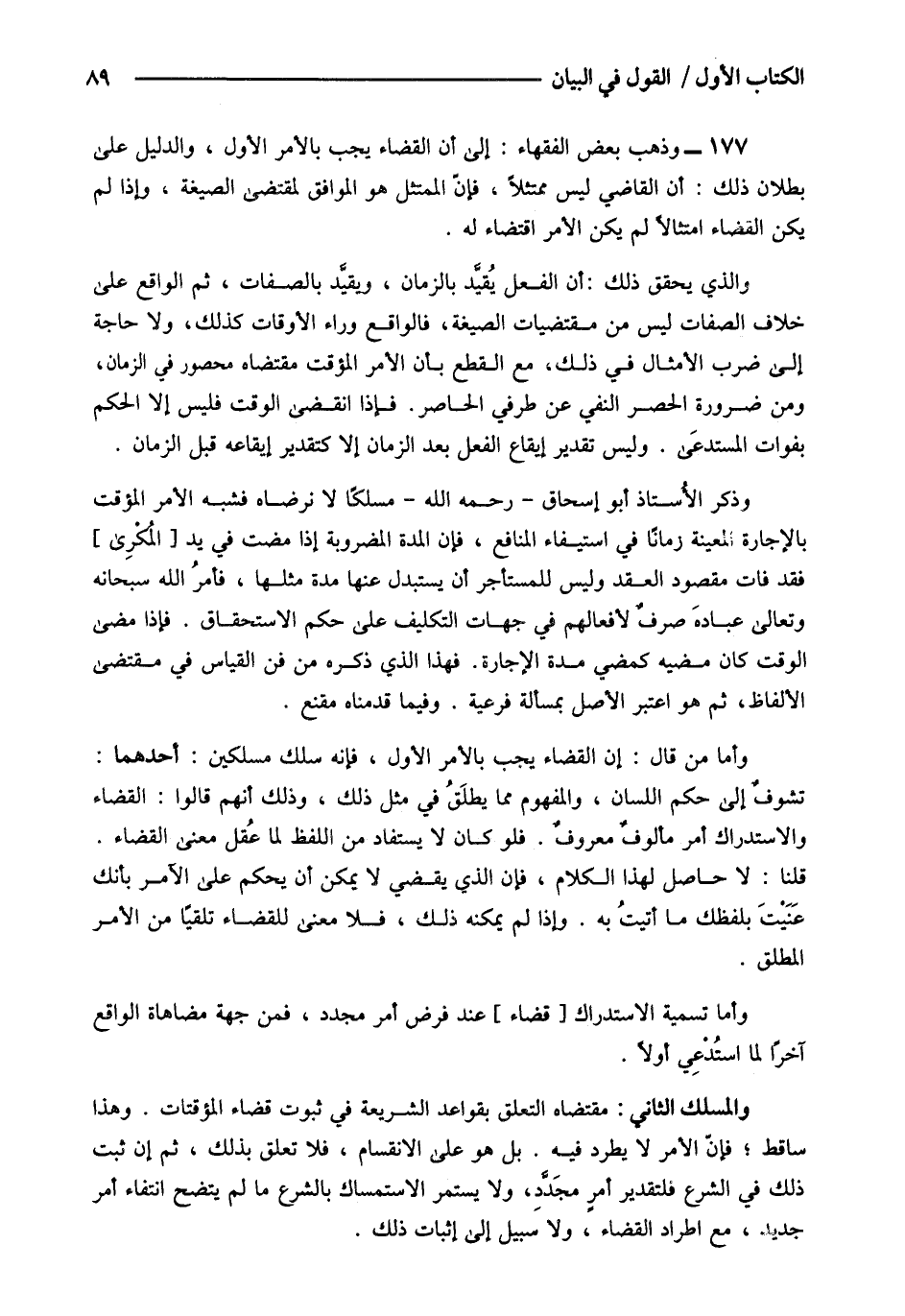177- وذهب بعض الفقهاء إلى أن القضاء يجب بالأمر الأول والدليل على بطلان ذلك أن القاضي ليس ممتثلا فإن الممتثل هو الموافق لمقتضى الصيغة وإذا لم يكن القضاء امتثالا لم يكن الأمر اقتضاء له.