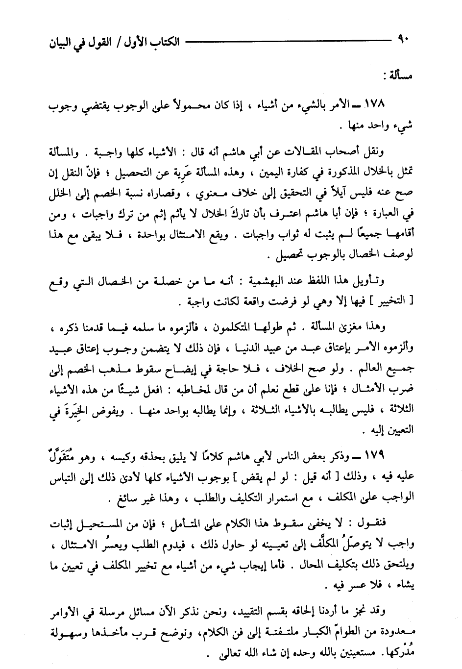 179- وذكر بعض الناس لأبي هاشم كلاما لا يليق بحذقه وكيسه وهو متقول عليه فيه وذلك [أنه قيل: لو لم يقض] بوجوب الأشياء كلها لأدى ذلك إلى التباس الواجب على المكلف مع استمرار التكليف والطلب وهذا غير سائغ.