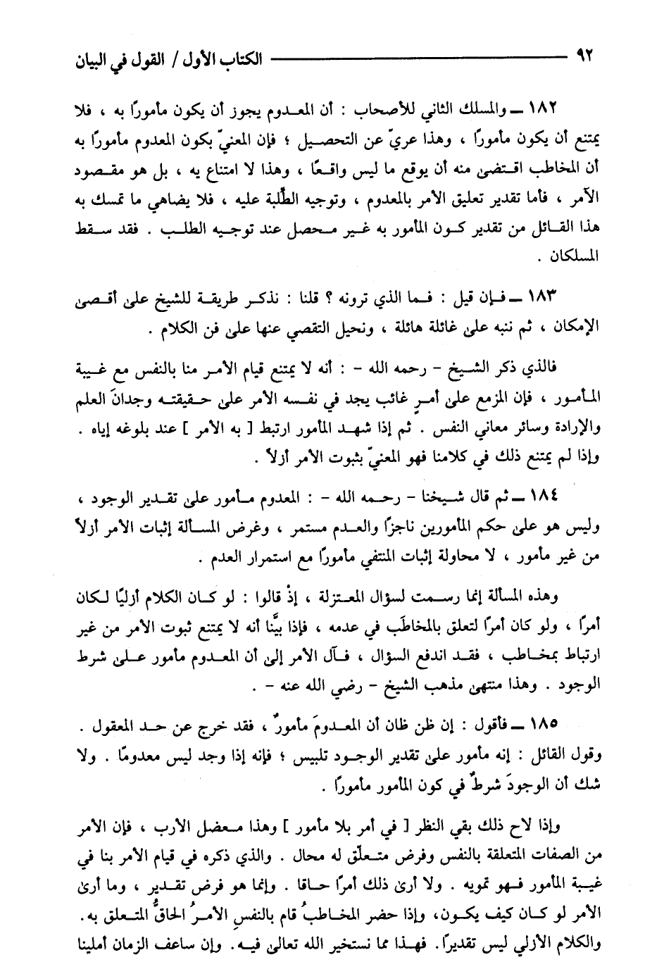 184- ثم قال شيخنا رحمه الله: المعدوم مأمور على تقدير الوجود وليس هو على حكم المأمورين ناجزا والعدم مستمر وغرض المسألة إثبات الأمر أزلا من غير مأمور ولا محاولة إثبات المنتفي مأمورا مع استمرار العدم.