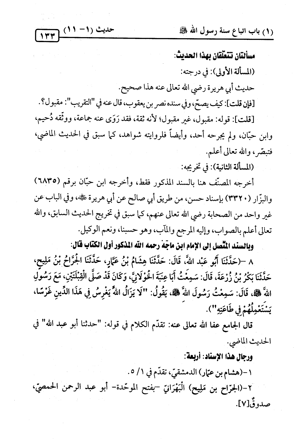 8 - (حَدَّثَنَا أبو عَبْد الله، قَالَ: حَدَّثَنَا هِشَامُ بْنُ عَمَّار، حَدَّثنا الجرَّاحُ بْنُ مَلِيحٍ، حَدَّثَنَا بَكْرُ بْنُ زُرْعَةَ، قَالَ: سَمِعْتُ أبا عِنَبَةَ الخُوْلَانِيَّ، وَكَانَ قَدْ صَلَّى الْقِبْلَتَيْنِ، مَعَ رَسُولِ الله -صلى الله عليه وسلم-، قَالَ: سَمِعْتُ رَسُولَ الله -صلى الله عليه وسلم-، يَقُولُ: "لَا يَزَالُ الله يَغْرِسُ في هَذَا الدِّينِ غَرْسًا، يَستَعْمِلُهُمْ في طَاعَتِهِ").