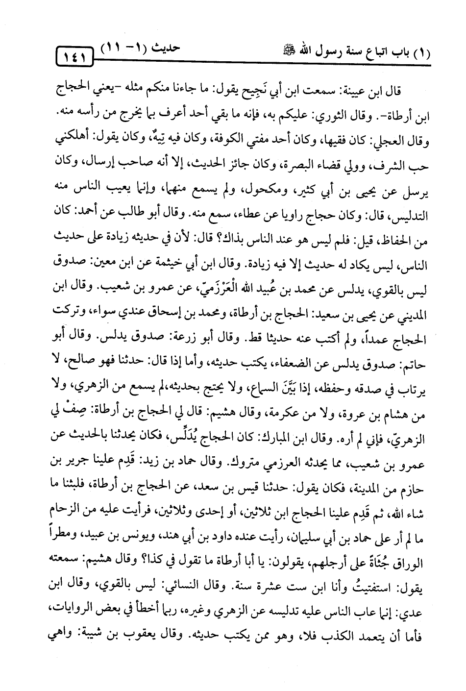 قال ابن عيينة: سمعت ابن أبي نَجِيح يقول: ما جاءنا منكم مثله -يعني الحجاج ابن أرطاة-. وقال الثوري: عليكم به، فإنه ما بقي أحد أعرف بما يخرج من رأسه منه. وقال العجلي: كان فقيها، وكان أحد مفتي الكوفة، وكان فيه تِيهٌ، وكان يقول: أهلكني حب الشرف، وولي قضاء البصرة، وكان جائز الحديث، إلا أنه صاحب إرسال، وكان يرسل عن يحيى بن أبي كثير، ومكحول، ولم يسمع منهما، وإنما يعيب الناس منه التدليس، قال: وكان حجاج راويا عن عطاء، سمع منه. وقال أبو طالب عن أحمد: كان من الحفاظ، قيل: فلم ليس هو عند الناس بذاك؟ قال: لأن في حديثه زيادة على حديث الناس، ليس يكاد له حديث إلا فيه زيادة. وقال ابن أبي خيثمة عن ابن معين: صدوق ليس بالقوي، يدلس عن محمد بن عُبيد الله الْعَرْزَميّ، عن عمرو بن شعيب. وقال ابن المديني عن يحيى بن سعيد: الحجاج بن أرطاة، ومحمد بن إسحاق عندي سواء، وتركت الحجاج عمدًا، ولم أكتب عنه حديثا قط. وقال أبو زرعة: صدوق يدلس. وقال أبو حاتم: صدوق يدلس عن الضعفاء، يكتب حديثه، وأما إذا قال: حدثنا فهو صالح، لا يرتاب في صدقه وحفظه، إذا بَيَّنَ السماع، ولا يحتج بحديثه، لم يسمع من الزهري، ولا من هشام بن عروة، ولا من عكرمة، وقال هشيم: قال لي الحجاج بن أرطاة: صِفْ لي الزهريّ، فإني لم أره. وقال ابن المبارك: كان الحجاج يُدَلِّس، فكان يحدثنا بالحديث عن عمرو بن شعيب، مما يحدثه العرزمي متروك. وقال حماد بن زيد: قَدِم علينا جرير بن حازم من المدينة، فكان يقول: حدثنا قيس بن سعد، عن الحجاج بن أرطاة، فلبثنا ما شاء الله، ثم قَدِم علينا الحجاج ابن ثلاثين، أو إحدى وثلاثين، فرأيت عليه من الزحام ما لم أر على حماد بن أبي سليمان، رأيت عنده داود بن أبي هند، ويونس بن عبيد، ومطرًا الوراق جُثَاةً على أرجلهم، يقولون: يا أبا أرطاة ما تقول في كذا؟ وقال هشيم: سمعته يقول: استفتيتُ وأنا ابن ست عشرة سنة. وقال النسائي: ليس بالقوي، وقال ابن عدي: إنما عاب الناس عليه تدليسه عن الزهري وغيره، ربما أخطأ في بعض الروايات، فأما أن يتعمد الكذب فلا، وهو ممن يكتب حديثه. وقال يعقوب بن شيبة: واهي
