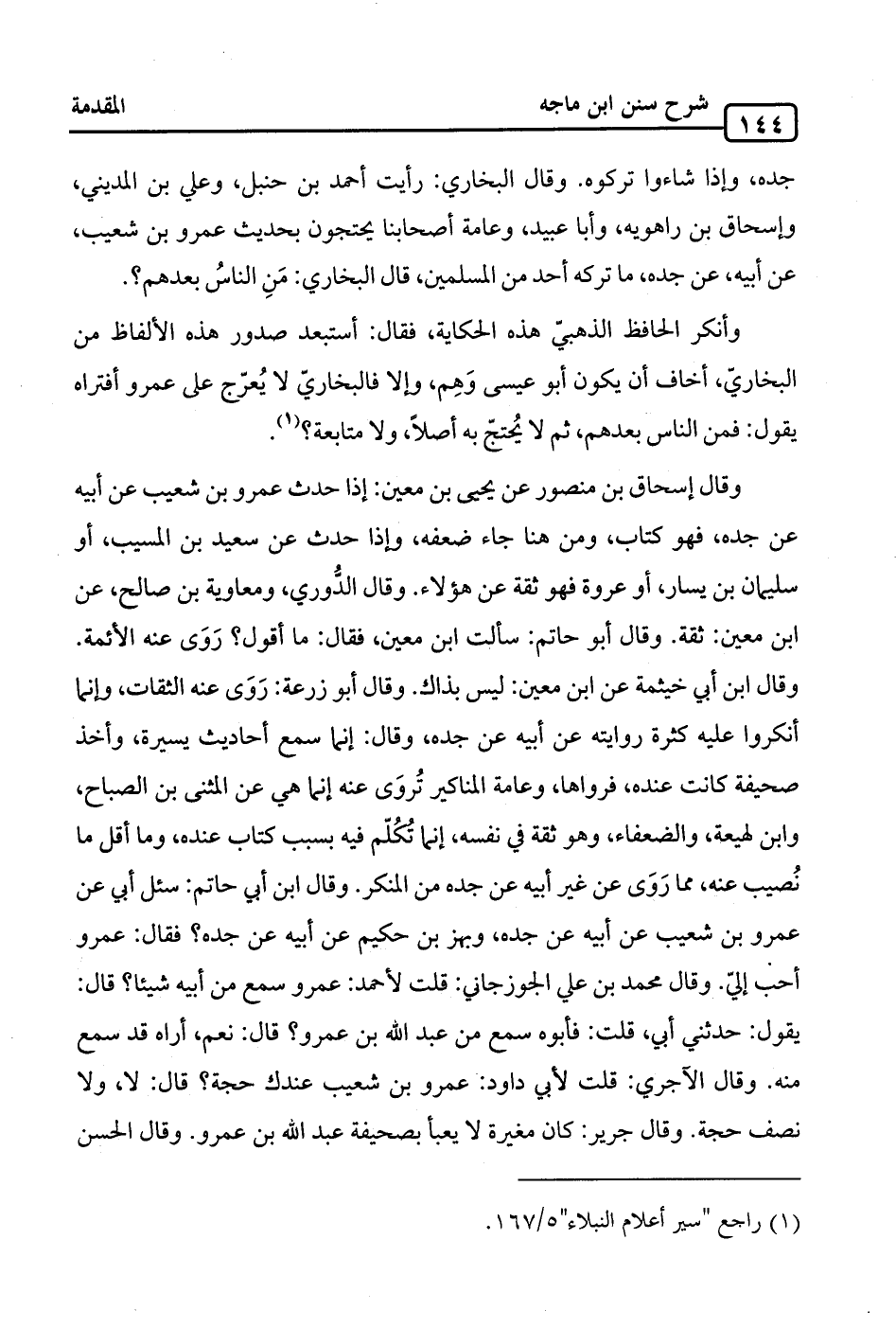 جده، وإذا شاءوا تركوه. وقال البخاري: رأيت أحمد بن حنبل، وعلي بن المديني، وإسحاق بن راهويه، وأبا عبيد، وعامة أصحابنا يحتجون بحديث عمرو بن شعيب، عن أبيه، عن جده، ما تركه أحد من المسلمين، قال البخاري: مَنِ الناسُ بعدهم؟.
