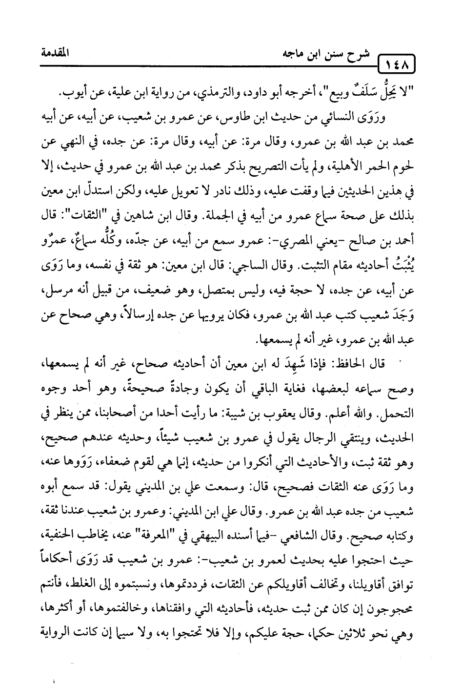 ورَوَى النسائي من حديث ابن طاوس، عن عمرو بن شعيب، عن أبيه، عن أبيه محمد بن عبد الله بن عمرو، وقال مرة: عن أبيه، وقال مرة: عن جده، في النهي عن لحوم الحمر الأهلية، ولم يأت التصريح بذكر محمد بن عبد الله بن عمرو في حديث، إلا في هذين الحديثين فيما وقفت عليه، وذلك نادر لا تعويل عليه، ولكن استدلّ ابن معين بذلك على صحة سماع عمرو من أبيه في الجملة. وقال ابن شاهين في "الثقات": قال أحمد بن صالح -يعني المصري-: عمرو سمع من أبيه، عن جدّه، وكُلُّه سماعٌ، عمرٌو يُثْبَتُ أحاديثه مقام التثبت. وقال الساجي: قال ابن معين: هو ثقة في نفسه، وما رَوَى عن أبيه، عن جده، لا حجة فيه، وليس بمتصل، وهو ضعيف، من قبيل أنه مرسل، وَجَدَ شعيب كتب عبد الله بن عمرو، فكان يرويها عن جده إرسالًا، وهي صحاح عن عبد الله بن عمرو، غير أنه لم يسمعها.