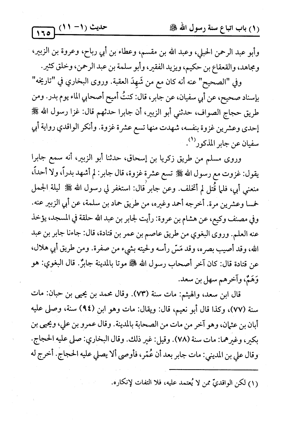 وروى مسلم من طريق زكريا بن إسحاق، حدثنا أبو الزبير، أنه سمع جابرا يقول: غزوت مع رسول الله -صلى الله عليه وسلم- تسع عشرة غزوة، قال جابر: لم أشهد بدرًا، ولا أحدًا، منعني أبي، فلما قُتل لم أتخلف. وعن جابر قال: استغفر لي رسول الله -صلى الله عليه وسلم- ليلة الجمل خمسا وعشرين مرة. أخرجه أحمد وغيره، من طريق حماد بن سلمة، عن أبي الزبير عنه. وفي مصنف وكيع، عن هشام بن عروة: رأيت لجابر بن عبد الله حلقة في المسجد، يؤخذ عنه العلم. وروى البغوي من طريق عاصم بن عمر بن قتادة، قال: جاءنا جابر بن عبد الله، وقد أصيب بصره، وقد مَسّ رأسه ولحيته بشيء من صفرة. ومن طريق أبي هلال، عن قتادة قال: كان آخر أصحاب رسول الله -صلى الله عليه وسلم- موتا بالمدينة جابرٌ. قال البغوي: هو وَهَمٌ، وآخرهم سهل بن سعد.
