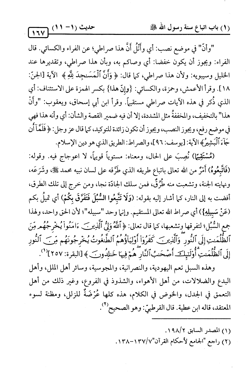 (مُسْتَقِيمًا) نُصِبَ على الحال، ومعناه: مستويًا قويمًا، لا اعوجاج فيه. وقوله: (فَاتَّبِعُوهُ) أَمْرٌ من الله تعالى باتباع طريقه الذي طَرَّقه على لسان نبيه محمد -صلى الله عليه وسلم-، وشَرَعَه، ونهايته الجنة، وتشعبت منه طُرُقٌ، فمن سلك الجادّة نجا، ومن خرج إلى تلك الطرق، أفضت به إلى النار، كما أشار إليه بقوله: (وَلَا تَتَّبِعُوا السُّبُلَ فَتَفَرَّقَ بِكُمْ) أي تميلُ بكم (عَنْ سَبِيلِهِ}) أي صراط الله تعالى المستقيم. وإنما وحد "سبيله"؛ لأن الحق واحد، ولهذا جمع السُّبُل؛ لتفرقها وتشعبها، كما قال تعالى: {اللَّهُ وَلِيُّ الَّذِينَ آمَنُوا يُخْرِجُهُمْ مِنَ الظُّلُمَاتِ إِلَى النُّورِ وَالَّذِينَ كَفَرُوا أَوْلِيَاؤُهُمُ الطَّاغُوتُ يُخْرِجُونَهُمْ مِنَ النُّورِ إِلَى الظُّلُمَاتِ أُولَئِكَ أَصْحَابُ النَّارِ هُمْ فِيهَا خَالِدُونَ} [البقرة: 257] (¬1).