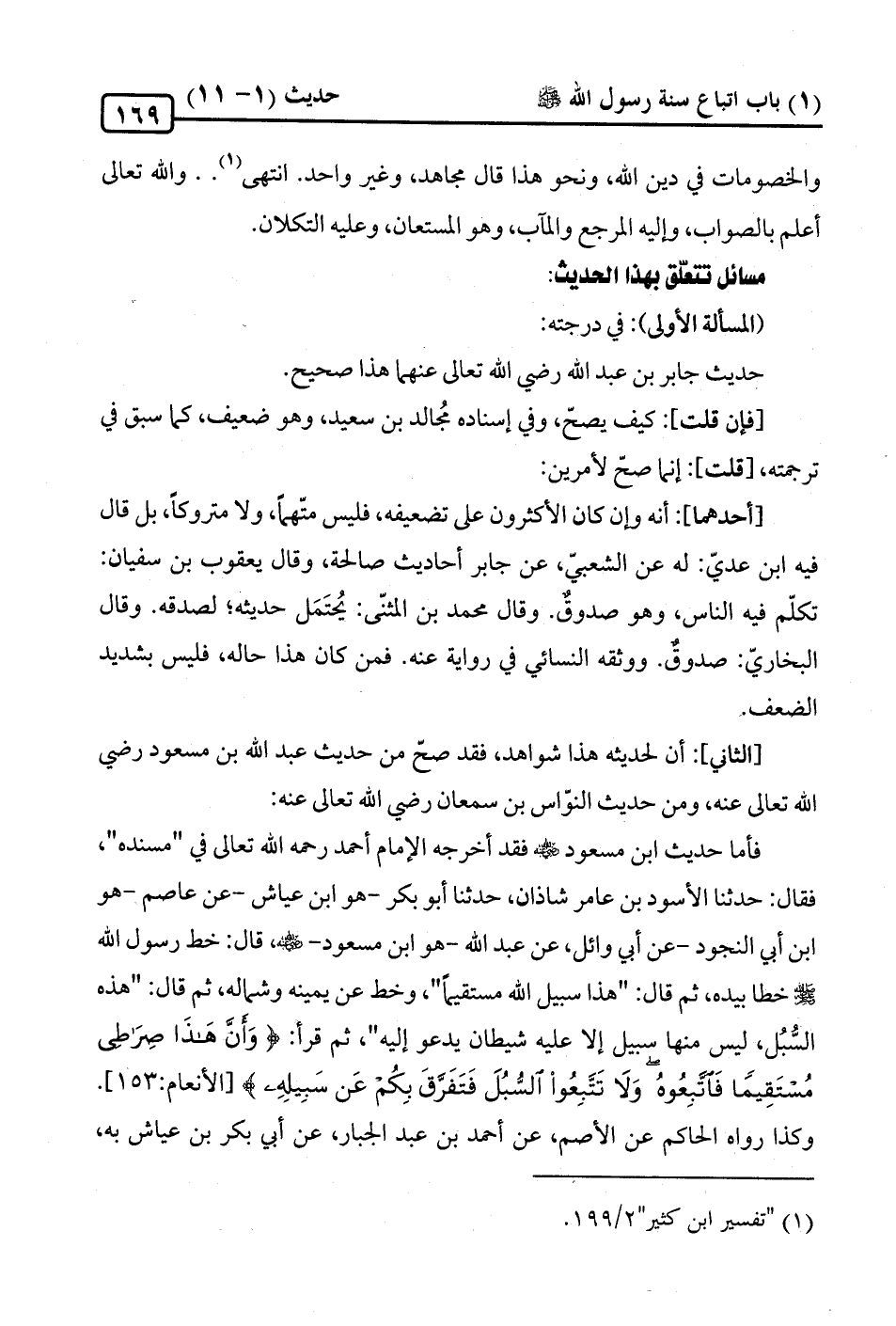 فأما حديث ابن مسعود -رضي الله عنه- فقد أخرجه الإمام أحمد رحمه الله تعالى في "مسنده"، فقال: حدثنا الأسود بن عامر شاذان، حدثنا أبو بكر -هو ابن عياش- عن عاصم -هو ابن أبي النجود- عن أبي وائل، عن عبد الله -هو ابن مسعود -رضي الله عنه-، قال: خط رسول الله -صلى الله عليه وسلم- خطا بيده، ثم قال: "هذا سبيل الله مستقيمًا"، وخط عن يمينه وشماله، ثم قال: "هذه السُّبُل، ليس منها سبيل إلا عليه شيطان يدعو إليه"، ثم قرأ: {وَأَنَّ هَذَا صِرَاطِي مُسْتَقِيمًا فَاتَّبِعُوهُ وَلَا تَتَّبِعُوا السُّبُلَ فَتَفَرَّقَ بِكُمْ عَنْ سَبِيلِهِ} [الأنعام: 153]. وكذا رواه الحاكم عن الأصم، عن أحمد بن عبد الجبار، عن أبي بكر بن عياش به،