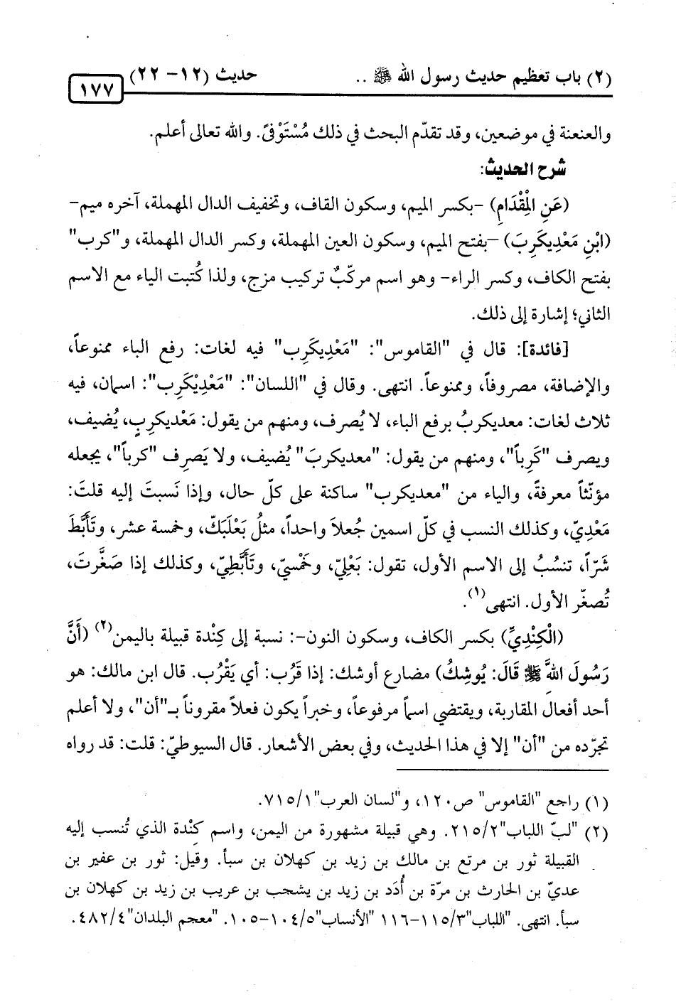 (عَنِ الْمِقْدَامِ) -بكسر الميم، وسكون القاف، وتخفيف الدال المهملة، آخره ميم- (ابْنِ مَعْدِيكَرِبَ) -بفتح الميم، وسكون العين المهملة، وكسر الدال المهملة، و"كرب" بفتح الكاف، وكسر الراء- وهو اسم مركّبٌ تركيب مزج، ولذا كُتبت الياء مع الاسم الثاني؛ إشارة إلى ذلك.