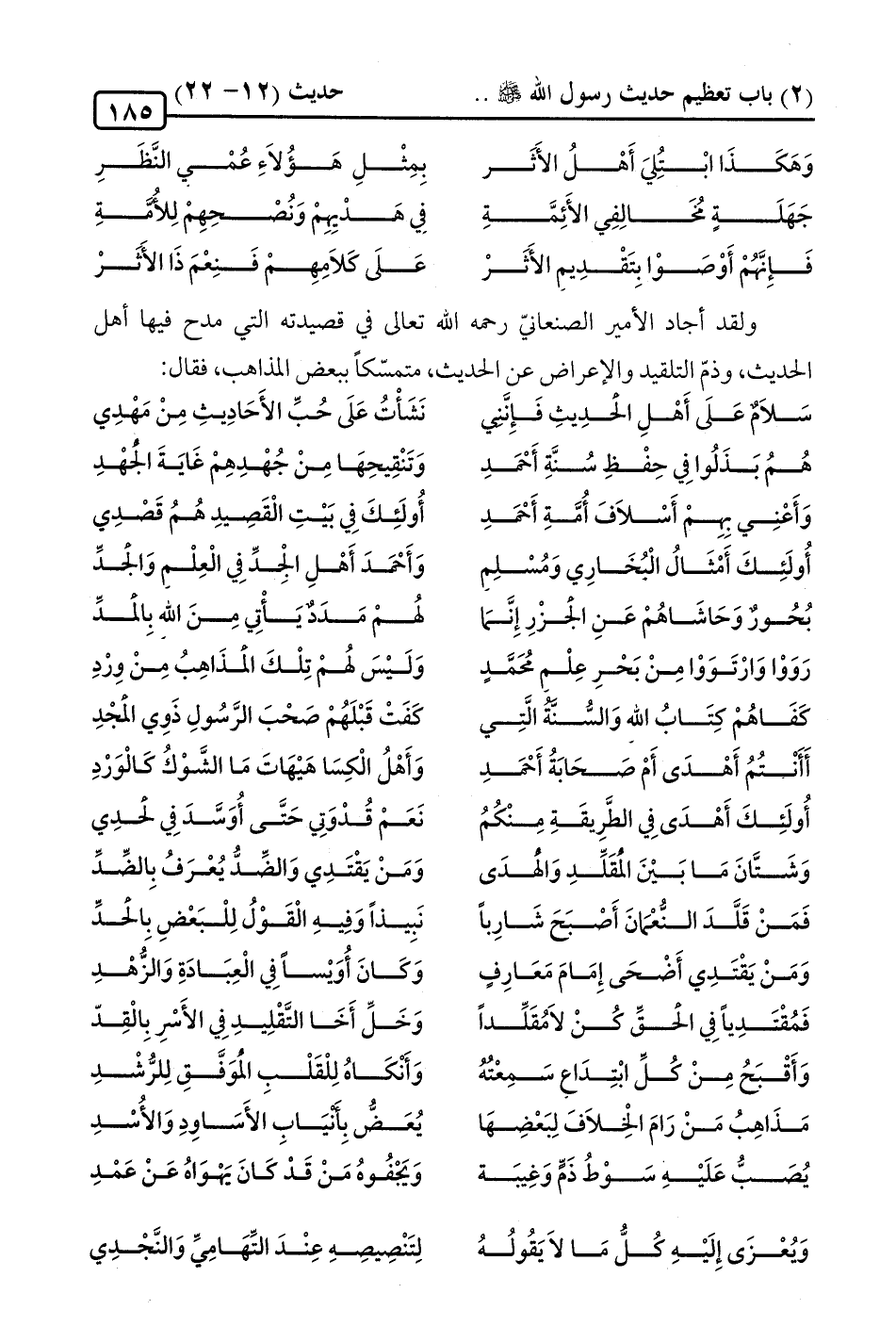 ولقد أجاد الأمير الصنعانيّ رحمه الله تعالى في قصيدته التي مدح فيها أهل الحديث، وذمّ التلقيد والإعراض عن الحديث، متمسّكًا ببعض المذاهب، فقال: