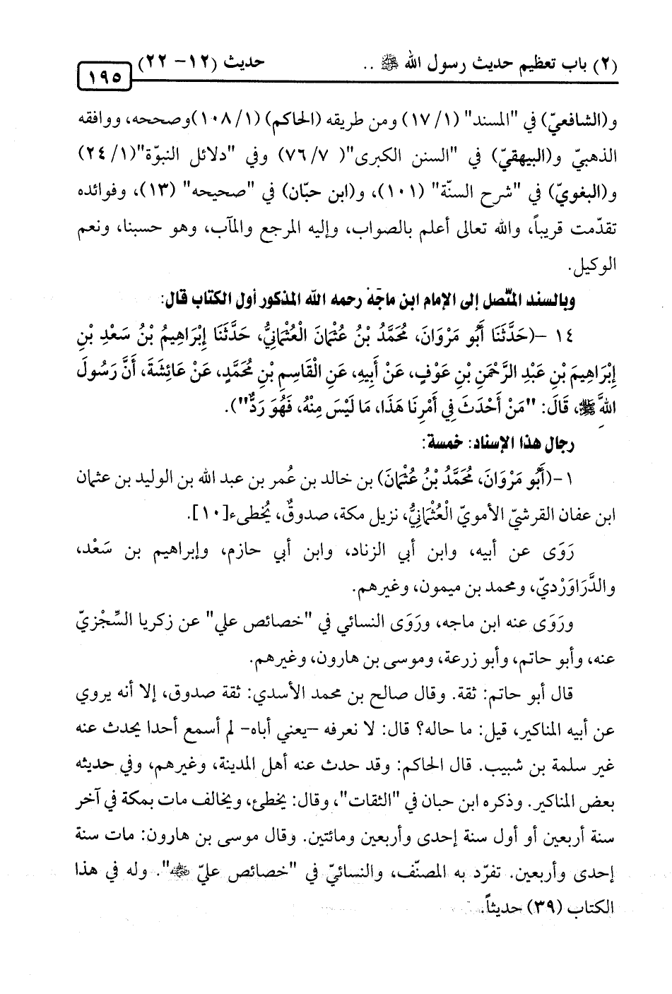 14 - (حَدَّثَنَا أَبو مَرْوَانَ، مُحَمَّدُ بْنُ عُثَمانَ الْعُثَمانِيُّ، حَدَّثَنَا إِبْرَاهِيمُ بْنُ سَعْدِ بْنِ إِبْرَاهِيمَ بْنِ عَبْدِ الرَّحْمَنِ بْنِ عَوْفٍ، عَنْ أَبِيهِ، عَنِ الْقَاسِمِ بْنِ مُحَمَّدٍ، عَنْ عَائِشَةَ، أَنَّ رَسُولَ الله -صلى الله عليه وسلم-، قَالَ: "مَنْ أَحْدَثَ في أَمْرِنَا هَذَا، مَا لَيْسَ مِنْهُ، فَهُوَ رَدٌّ").