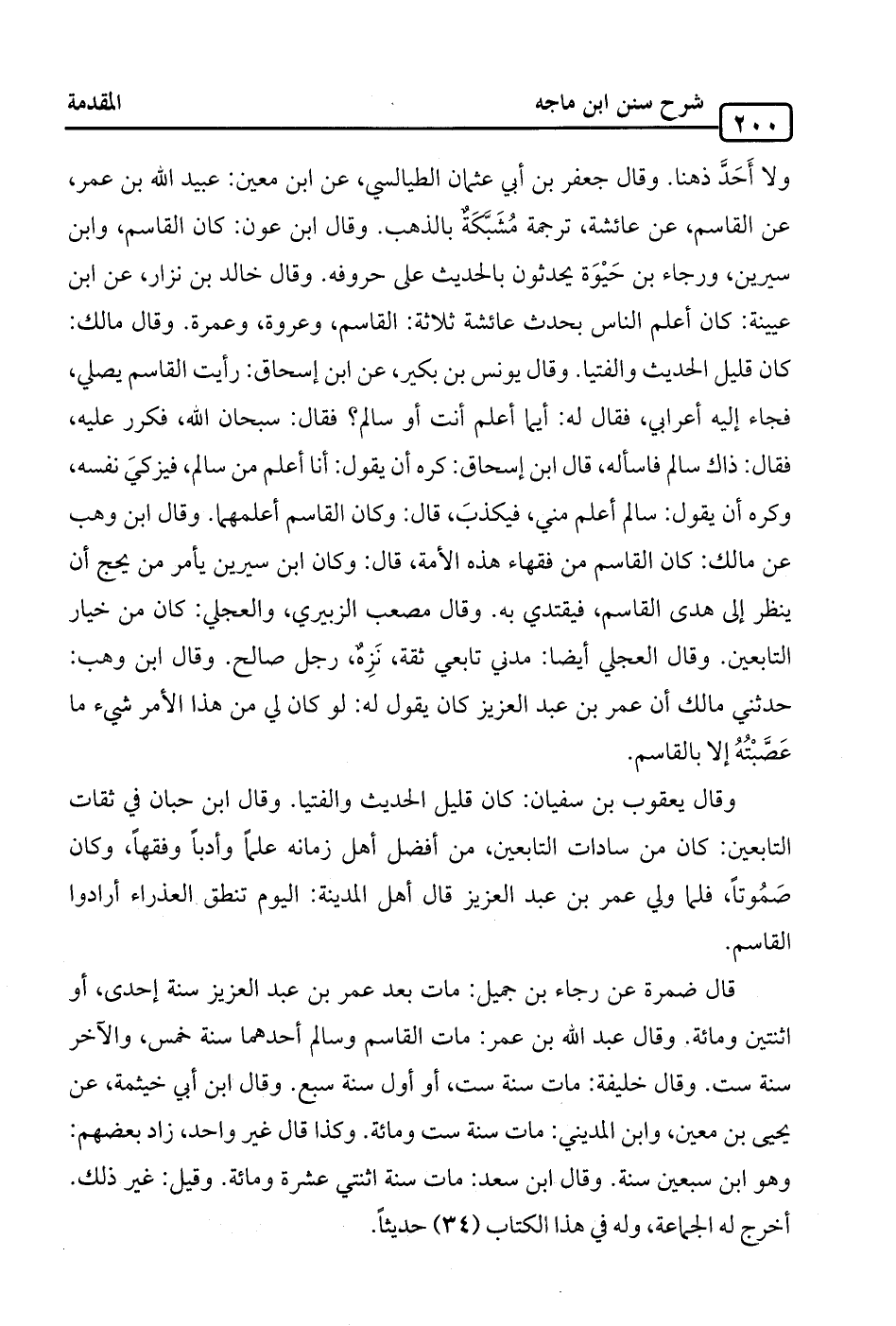 ولا أَحَدَّ ذهنا. وقال جعفر بن أبي عثمان الطيالسي، عن ابن معين: عبيد الله بن عمر، عن القاسم، عن عائشة، ترجمة مُشَبّكَةٌ بالذهب. وقال ابن عون: كان القاسم، وابن سيرين، ورجاء بن حَيْوَة يحدثون بالحديث على حروفه. وقال خالد بن نزار، عن ابن عيينة: كان أعلم الناس بحدث عائشة ثلاثة: القاسم، وعروة، وعمرة. وقال مالك: كان قليل الحديث والفتيا. وقال يونس بن بكير، عن ابن إسحاق: رأيت القاسم يصلي، فجاء إليه أعرابي، فقال له: أيما أعلم أنت أو سالم؟ فقال: سبحان الله، فكرر عليه، فقال: ذاك سالم فاسأله، قال ابن إسحاق: كره أن يقول: أنا أعلم من سالم، فيزكيَ نفسه، وكره أن يقول: سالم أعلم مني، فيكذبَ، قال: وكان القاسم أعلمهما. وقال ابن وهب عن مالك: كان القاسم من فقهاء هذه الأمة، قال: وكان ابن سيرين يأمر من يحج أن ينظر إلى هدى القاسم، فيقتدي به. وقال مصعب الزبيري، والعجلي: كان من خيار التابعين. وقال العجلي أيضا: مدني تابعي ثقة، نَزِهٌ، رجل صالح. وقال ابن وهب: حدثني مالك أن عمر بن عبد العزيز كان يقول له: لو كان لي من هذا الأمر شيء ما عَصَّبْتُهُ إلا بالقاسم.