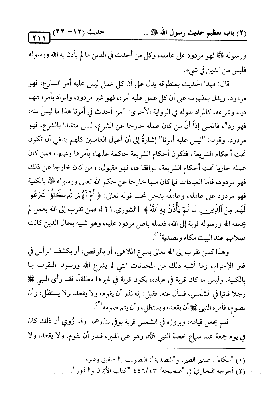 قال: فهذا الحديث بمنطوقه يدل على أن كل عمل ليس عليه أمر الشارع، فهو مردود، ويدل بمفهومه على أن كل عمل عليه أمره، فهو غير مردود، والمراد بأمره ههنا دينه وشرعه، كالمراد بقوله في الرواية الأخرى: "من أحدث في أمرنا هذا ما ليس منه، فهو رد"، فالمعنى إذًا أنّ من كان عمله خارجا عن الشرع، ليس متقيدا بالشرع، فهو مردود. وقوله: "ليس عليه أمرنا" إشارةٌ إلى أن أعمال العاملين كلهم ينبغي أن تكون تحت أحكام الشريعة، فتكون أحكام الشريعة حاكمة عليها، بأمرها ونهيها، فمن كان عمله جاريا تحت أحكام الشريعة، موافقا لها، فهو مقبول، ومن كان خارجا عن ذلك فهو مردود، فأما العبادات فما كان منها خارجا عن حكم الله تعالى ورسوله -صلى الله عليه وسلم- بالكلية فهو مردود على عامله، وعاملُه يدخل تحت قوله تعالى: {أَمْ لَهُمْ شُرَكَاءُ شَرَعُوا لَهُمْ مِنَ الدِّينِ مَا لَمْ يَأْذَنْ بِهِ} [الشورى: 21]، فمن تقرب إلى الله بعمل لم يجعله الله ورسوله قربة إلى الله، فعمله باطل مردود عليه، وهو شبيه بحال الذين كانت صلاتهم عند البيت مكاء وتصدية (¬1).
