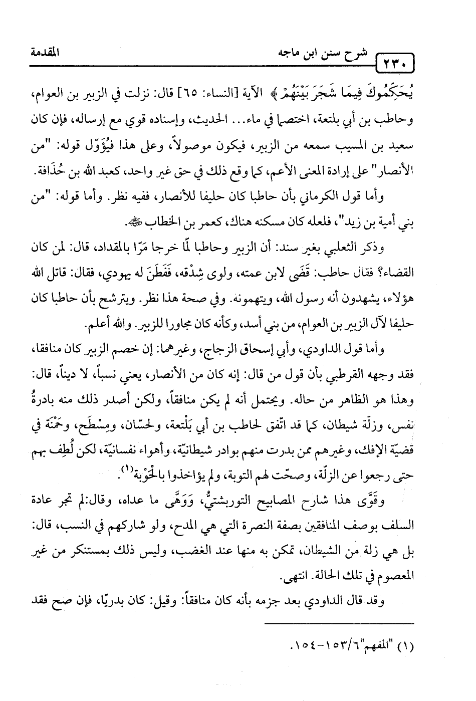 وأما قول الداودي، وأبي إسحاق الزجاج، وغيرهما: إن خصم الزبير كان منافقا، فقد وجهه القرطبي بأن قول من قال: إنه كان من الأنصار، يعني نسبًا، لا دينًا، قال: وهذا هو الظاهر من حاله. ويحتمل أنه لم يكن منافقًا، ولكن أصدر ذلك منه بادرةُ نفس، وزلّة شيطان، كما قد اتّفق لحاطب بن أبي بَلْتعة، ولحسّان، ومِسْطَح، وحَمْنَة في قضيّة الإفك، وغيرهم ممن بدرت منهم بوادر شيطانيّة، وأهواء نفسانيّة، لكن لُطِف بهم حتى رجعوا عن الزلّة، وصحّت لهم التوبة، ولم يؤاخذوا بالْحَوْبة (¬1).