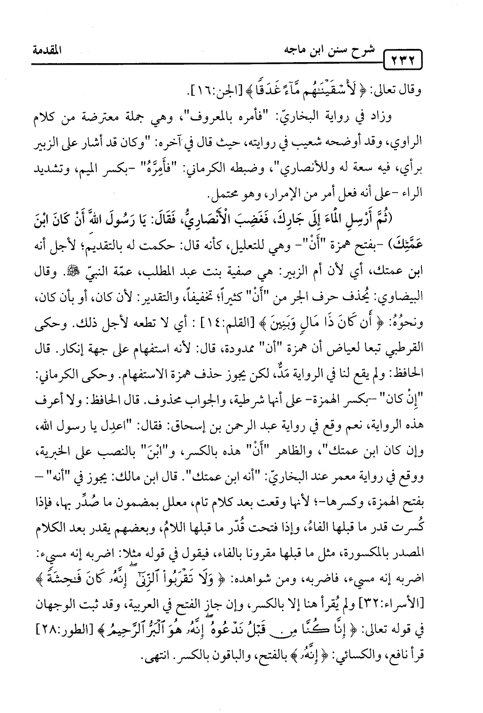 (ثُمَّ أَرْسِلِ الماءَ إِلَى جَارِكَ، فَغَضِبَ الْأَنْصَارِيُّ، فَقَالَ: يَا رَسُولَ الله أَنْ كَانَ ابْنَ عَمَّتِكَ) -بفتح همزة "أَنْ"- وهي للتعليل، كأنه قال: حكمت له بالتقديم؛ لأجل أنه ابن عمتك، أي لأن أم الزبير: هي صفية بنت عبد المطلب، عمّة النبيّ -صلى الله عليه وسلم-. وقال البيضاوي: يُحذف حرف الجر من "أَنْ" كثيرًا" تخفيفًا، والتقدير: لأن كان، أو بأن كان، ونحوهُ: {أَنْ كَانَ ذَا مَالٍ وَبَنِينَ} [القلم: 14]: أي لا تطعه لأجل ذلك. وحكى القرطبي تبعا لعياض أن همزة "أن" ممدودة، قال: لأنه استفهام على جهة إنكار. قال الحافظ: ولم يقع لنا في الرواية مَدٌّ، لكن يجوز حذف همزة الاستفهام. وحكى الكرماني: "إِنْ كان" -بكسر الهمزة- على أنها شرطية، والجواب محذوف. قال الحافظ: ولا أعرف هذه الرواية، نعم وقع في رواية عبد الرحمن بن إسحاق: فقال: "اعدِل يا رسول الله، وإن كان ابن عمتك"، والظاهر "أَنْ" هذه بالكسر، و"ابْنَ" بالنصب على الخبرية، ووقع في رواية معمر عند البخاريّ: "أنه ابن عمتك". قال ابن مالك: يجوز في "أنه" -بفتح الهمزة، وكسرها-؛ لأنها وقعت بعد كلام تام، معلل بمضمون ما صُدِّر بها، فإذا كُسرت قدر ما قبلها الفاءُ، وإذا فتحت قُدّر ما قبلها اللامُ، وبعضهم يقدر بعد الكلام المصدر بالمكسورة، مثل ما قبلها مقرونا بالفاء، فيقول في قوله مثلا: اضربه إنه مسيِء: اضربه إنه مسيء، فاضربه، ومن شواهده: {وَلَا تَقْرَبُوا الزِّنَا إِنَّهُ كَانَ فَاحِشَةً} [الإسراء: 32] ولم يُقرأ هنا إلا بالكسر، وإن جاز الفتح في العربية، وقد ثبت الوجهان في قوله تعالى: {إِنَّا كُنَّا مِنْ قَبْلُ نَدْعُوهُ إِنَّهُ هُوَ الْبَرُّ الرَّحِيمُ} [الطور: 28] قرأ نافع، والكسائي: {إِنَّهُ} بالفتح، والباقون بالكسر. انتهى.