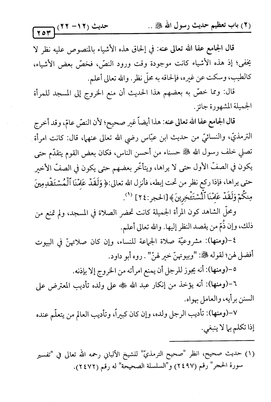 ومحلّ الشاهد كون المرأة الجميلة كانت تحضر الصلاة في المسجد، ولم تمنع من ذلك، وإن ذُمّ من يقصد النظر إليها. والله تعالى أعلم.