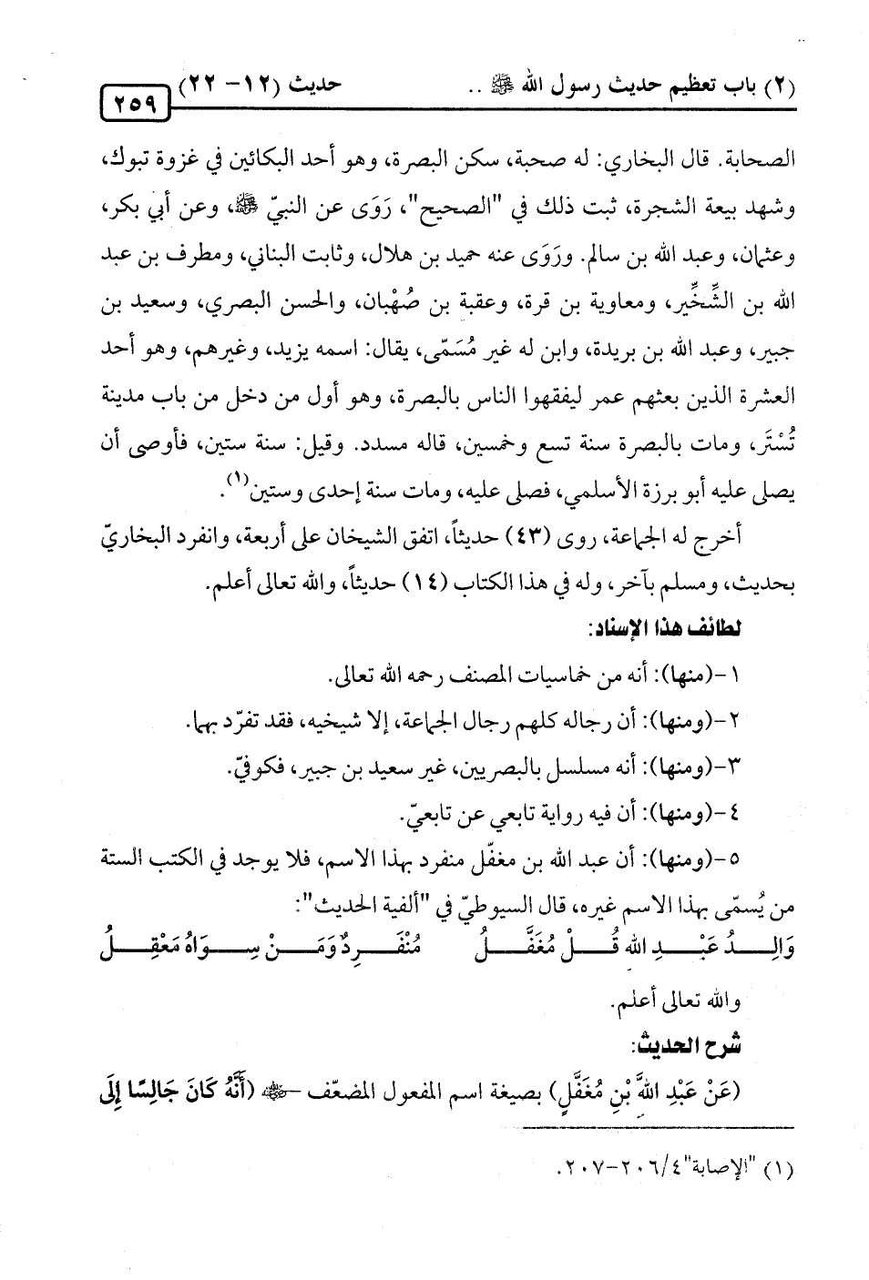 5 - (ومنها): أن عبد الله بن مغفّل منفرد بهذا الاسم، فلا يوجد في الكتب الستة من يُسمّى بهذا الاسم غيره، قال السيوطيّ في "ألفية الحديث".