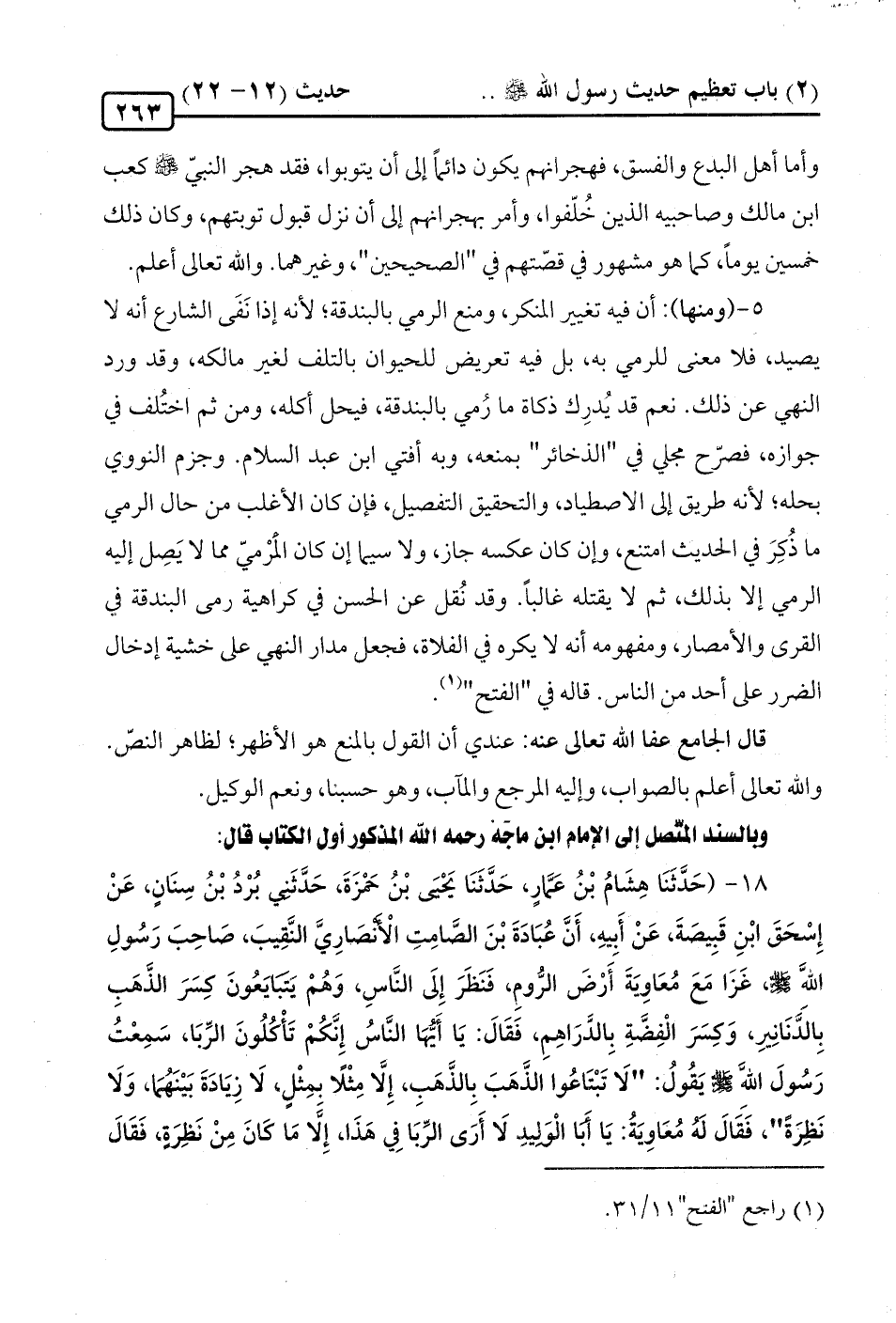 18 - (حَدَّثَنَا هِشَامُ بْنُ عَمَّارٍ، حَدَّثَنَا يَحْيَى بْنُ حَمْزَةَ، حَدَّثَنِي بُرْدُ بْنُ سِنَانٍ، عَنْ إِسْحَقَ ابْنِ قَبِيصَةَ، عَنْ أَبِيهِ، أَنَّ عُبَادَةَ بْنَ الصَّامِتِ الْأَنْصَارِيَّ النَّقِيبَ، صَاحِبَ رَسُولِ الله -صلى الله عليه وسلم-، غَزَا مَعَ مُعَاوِيَةَ أَرْضَ الرُّومِ، فَنَظَرَ إِلَى النَّاسِ، وَهُمْ يَتَبَايَعُونَ كِسَرَ الذَّهَبِ بِالَدَّنَانِيرِ، وَكِسَرَ الْفِضَّةِ بِالدَّرَاهمِ، فَقَالَ: يَا أَيُّهَا النَّاسُ إِنَّكُمْ تَأْكُلُونَ الرِّبَا، سَمِعْتُ رَسُولَ الله -صلى الله عليه وسلم- يَقُولُ: "لَا تَبْتَاعُوا الذَّهَبِ بِالذَّهَبِ، إِلَّا مِثْلًا بمِثْلٍ، لَا زِيَادَةَ بَيْنَهُمَا، وَلَا نَظِرَةً"، فَقَالَ لَهُ مُعَاوِيَةُ: يَا أَبَا الْوَلِيدِ لَا أَرَى الرِّبَا في هَذَا، إِلا مَا كَانَ مِنْ نَظِرَةٍ، فَقَال