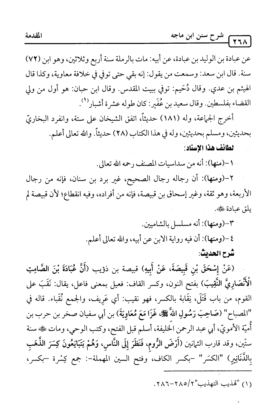 2 - (ومنها): أن رجاله رجال الصحيح، غير برد بن سنان، فإنه من رجال الأربعة، وهو ثقة، وغير إسحاق بن قبيصة، فإنه من أفراده، وفيه انقطاع؛ لأن قبيصة لم يلق عبادة -رضي الله عنه-.