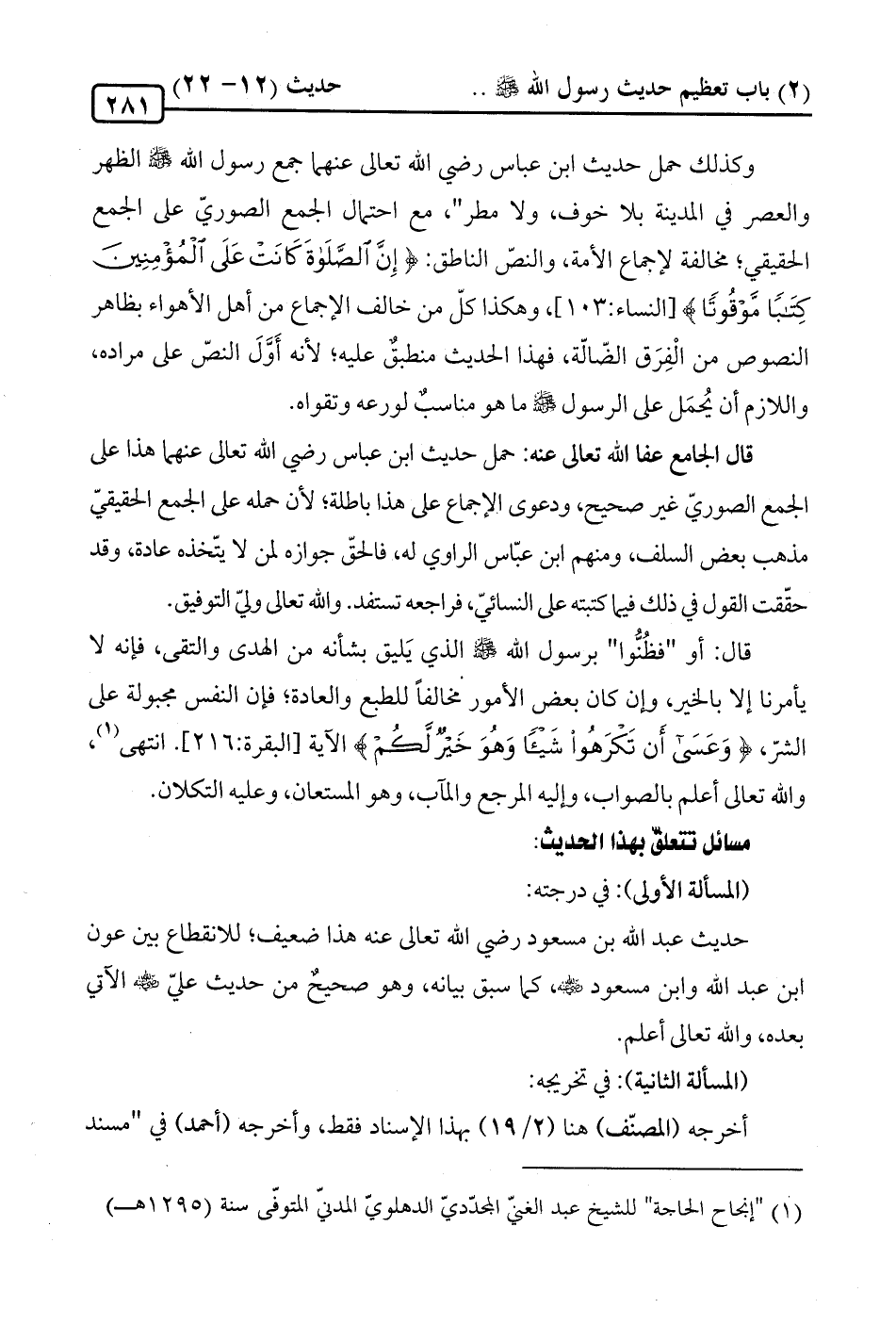 قال الجامع عفا الله تعالى عنه: حمل حديث ابن عباس رضي الله تعالى عنهما هذا على الجمع الصوريّ غير صحيح، ودعوى الإجماع على هذا باطلة؛ لأن حمله على الجمع الحقيقيّ مذهب بعض السلف، ومنهم ابن عبّاس الراوي له، فالحقّ جوازه لمن لا يتّخذه عادة، وقد حقّقت القول في ذلك فيما كتبته على النسائيّ، فراجعه تستفد. والله تعالى وليّ التوفيق.