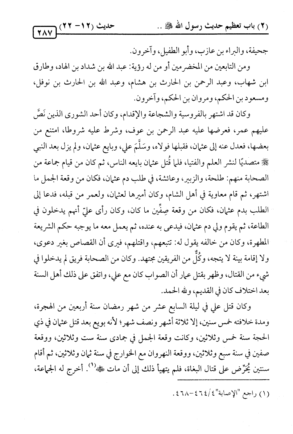 وكان قد اشتهر بالفروسية والشجاعة والإقدام، وكان أحد الشورى الذين نَصَّ عليهم عمر، فعرضها عليه عبد الرحمن بن عوف، وشرط عليه شروطا، امتنع من بعضها، فعدل عنه إلى عثمان، فقبلها فولاه، وسَلَّمَ علي، وبايع عثمان، ولم يزل بعد النبي -صلى الله عليه وسلم- متصديًا لنشر العلم والفتيا، فلما قُتل عثمان بايعه الناس، ثم كان من قيام جماعة من الصحابة منهم: طلحة، والزبير، وعائشة، في طلب دم عثمان، فكان من وقعة الجمل ما اشتهر، ثم قام معاوية في أهل الشام، وكان أميرها لعثمان، ولعمر من قبله، فدعا إلى الطلب بدم عثمان، فكان من وقعة صِفِّين ما كان، وكان رأى عليّ أنهم يدخلون في الطاعة، ثم يقوم ولي دم عثمان، فيدعى به عنده، ثم يعمل معه ما يوجبه حكم الشريعة المطهرة، وكان من خالفه يقول له: تتبعهم، واقتلهم، فيرى أن القصاص بغير دعوى، ولا إقامة بينة لا يتجه، وكُلٌّ من الفريقين مجتهد. وكان من الصحابة فريق لم يدخلوا في شيء من القتال، وظهر بقتل عمار أن الصواب كان مع علي، واتفق على ذلك أهل السنة بعد اختلاف كان في القديم، ولله الحمد.