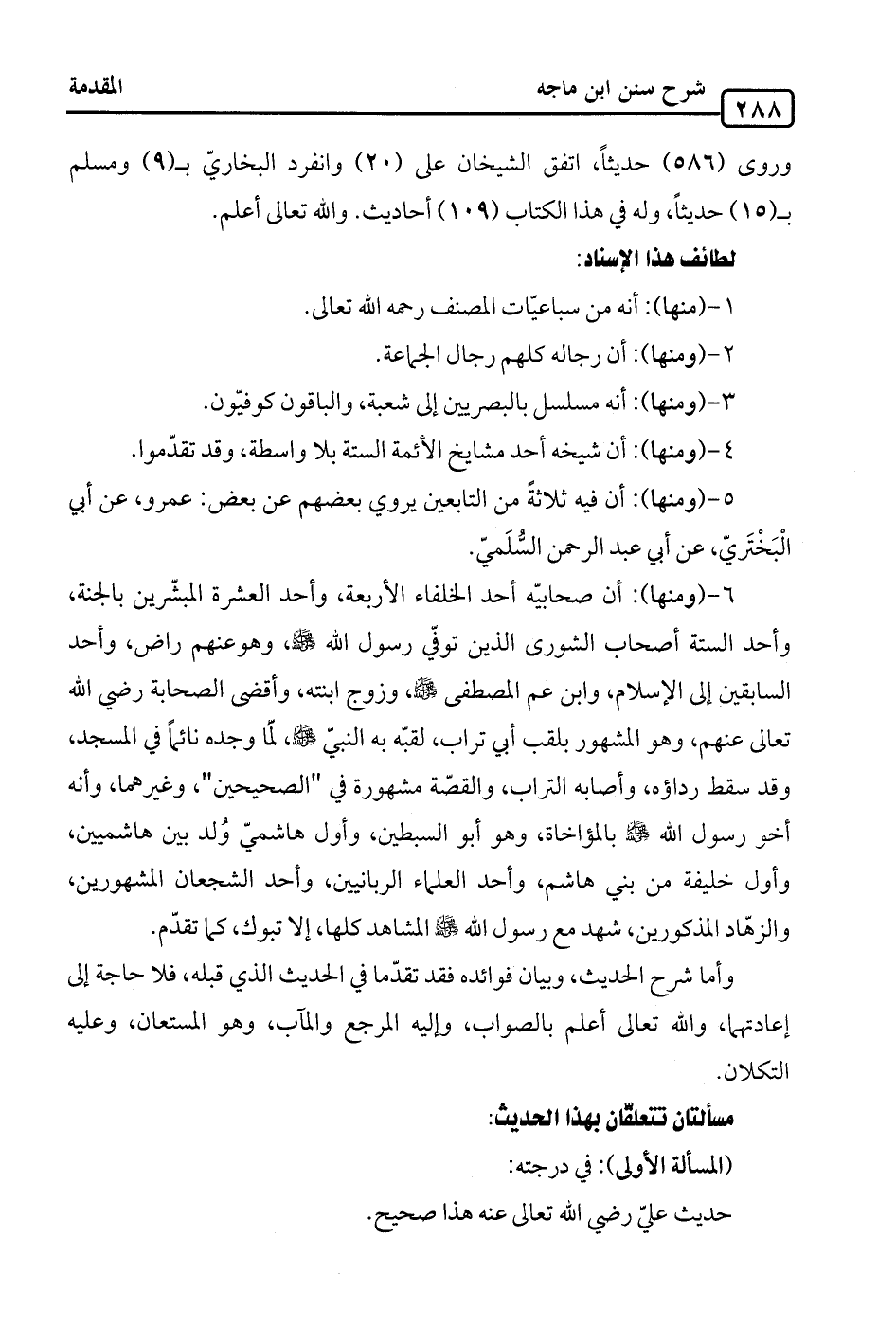 6 - (ومنها): أن صحابيّه أحد الخلفاء الأربعة، وأحد العشرة المبشّرين بالجنة، وأحد الستة أصحاب الشورى الذين توفّي رسول الله -صلى الله عليه وسلم-، وهو عنهم راض، وأحد السابقين إلى الإسلام، وابن عم المصطفى -صلى الله عليه وسلم-، وزوج ابنته، وأقضى الصحابة رضي الله تعالى عنهم، وهو المشهور بلقب أبي تراب، لقبّه به النبيّ -صلى الله عليه وسلم-، لمّا وجده نائمًا في المسجد، وقد سقط رداؤه، وأصابه التراب، والقصّة مشهورة في "الصحيحين"، وغيرهما، وأنه أخو رسول الله -صلى الله عليه وسلم- بالمؤاخاة، وهو أبو السبطين، وأول هاشميّ وُلد بين هاشميين، وأول خليفة من بني هاشم، وأحد العلماء الربانيين، وأحد الشجعان المشهورين، والزهّاد المذكورين، شهد مع رسول الله -صلى الله عليه وسلم- المشاهد كلها، إلا تبوك، كما تقدّم.