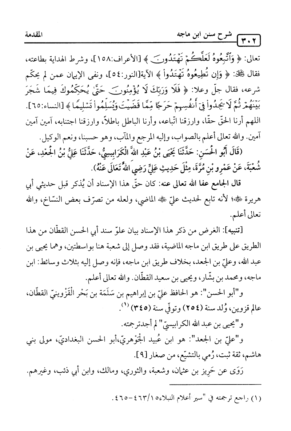 [تنبيه]: الغرض من ذكر هذا الإسناد بيان علوّ سند أبي الحسن القطّان من هذا الطريق على طريق ابن ماجه الماضية، فقد وصل إلى شعبة هنا بواسطتين، وهما يحيى بن عبد الله، وعليّ بن الجعد، بخلاف طريق ابن ماجه، فإنه وصل إليه بثلاث وسائط: ابن ماجه، ومحمد بن بشّار، ويحيى بن سعيد القطّان. والله تعالى أعلم.