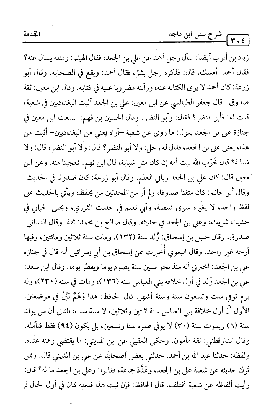 زياد بن أيوب أيضا: سأل رجل أحمد عن علي بن الجعد، فقال الهيثم: ومثله يسأل عنه؟ فقال أحمد: أمسك، قال: فذكره رجل بشرّ، فقال أحمد: ويقع في الصحابة. وقال أبو زرعة: كان أحمد لا يرى الكتابه عنه، ورأيته مضروبا عليه في كتابه. وقال ابن معين: ثقة صدوق. قال جعفر الطيالسي عن ابن معين: علي بن الجعد أثبت البغداديين في شعبة، قلت له: فأبو النضر؟ فقال: وأبو النضر. وقال الحسين بن فهم: سمعت ابن معين في جنازة علي بن الجعد يقول: ما روى عن شعبة -أراه يعني من البغداديين- أثبت من هذا، يعني علي بن الجعد، فقال له رجل: ولا أبو النضر؟ قال: ولا أبو النضر، قال: ولا شبابة؟ قال خَرّب الله بيت أمه إن كان مثل شبابة، قال ابن فهم: فعجبنا منه. وعن ابن معين قال: كان علي بن الجعد رباني العلم. وقال أبو زرعة: كان صدوقا في الحديث. وقال أبو حاتم: كان متقنا صدوقا، ولم أر من المحدثين من يحفظ، ويأتي بالحديث على لفظ واحد، لا يغيره سوى قبيصة، وأبي نعيم في حديث الثوري، ويحيى الحماني في حديث شريك، وعلي بن الجعد في حديثه. وقال صالح بن محمد: ثقة. وقال النسائي: صدوق. وقال حنبل بن إسحاق: وُلد سن (132)، ومات سنة ثلاثين ومائتين، وفيها أرخه غير واحد. وقال البغوي أُخبرت عن إسحاق بن أبي إسرائيل أنه قال في جنازة علي بن الجعد: أخبرني أنه منذ نحو ستين سنة يصوم يوما ويفطر يوما. وقال ابن سعد: علي بن الجعد وُلد في أول خلافة بني العباس سن (136)، ومات في سنة (230)، وله يوم توفي ست وتسعون سنة وستة أشهر. قال الحافظ: هذا وَهَمٌ بَيِّنٌ في موضعين: الأول أنَّ أول خلافة بني العباس سنة اثنتين وثلاثين، لا سنة ست، الثاني أن من يولد سن (6) ويموت سنة (30) لا يوفي عمره ستا وتسعين، بل يكون (94) فقط فتأمله. وقال الدارقطني: ثقة مأمون. وحكى العقيلي عن ابن المديني: ما يقتضي وهنه عنده، ولفظه: حدثنا عبد الله بن أحمد، حدثني بعض أصحابنا عن علي بن المديني قال: وممن تُرك حديثه عن شعبة علي بن الجعد، وعَدَّدَ جماعة، فقالوا: وعلي بن الجعد ما له؟ قال: رأيت ألفاظه عن شعبة تختلف. قال الحافظ: فإن ثبت هذا فلعله كان في أول الحال لم