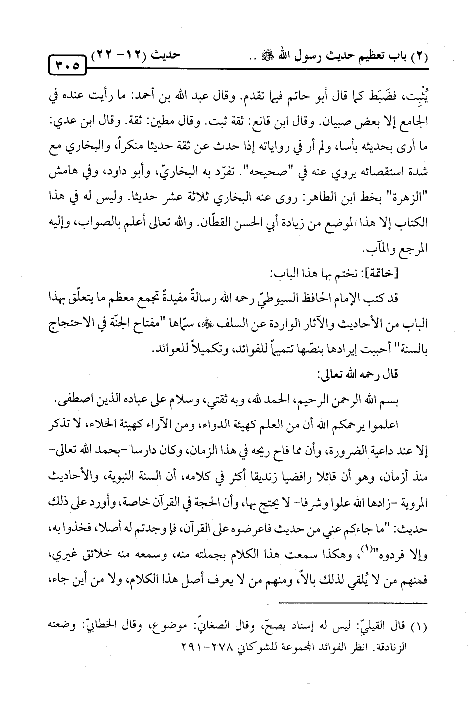 قد كتب الإمام الحافظ السيوطيّ رحمه الله رسالةً مفيدةً تجمع معظم ما يتعلّق بهذا الباب من الأحاديث والآثار الواردة عن السلف -رضي الله عنه-، سمّاها "مفتاح الجنّة في الاحتجاج بالسنة" أحببت إيرادها بنصّها تتميمًا للفوائد، وتكميلًا للعوائد.