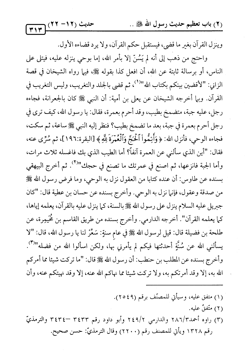 واحتج من ذهب إلى أنه لم يَسُنّ إلا بأمر الله، إما بوحي ينزله عليه، فيتلى على الناس، أو برسالة ثابتة عن الله، أن افعل كذا بقوله -صلى الله عليه وسلم-، فيما رواه الشيخان في قصة الزاني: "لأقضين بينكم بكتاب الله" (¬1)، ثم قضى بالجلد والتغريب، وليس التغريب في القرآن. وبما أخرجه الشيخان عن يعلى بن أمية: أن النبي -صلى الله عليه وسلم- كان بالجعرانة، فجاءه رجل، عليه جبة، متضمخ بطيب، وقد أحرم بعمرة، فقال: يا رسول الله، كيف ترى في رجل أحرم بعمرة في جبة، بعد ما تضمخ بطيب؟ فنظر إليه النبي -صلى الله عليه وسلم- ساعة، ثم سكت، فجاءه الوحي، فأنزل الله: {وَأَتِمُّوا الْحَجَّ وَالْعُمْرَةَ لِلَّهِ} [البقرة: 196]، ثم سُرِّى عنه، فقال: "أين الذي سألني عن العمرة آنفًا؟ أما الطيب الذي بك فاغسله ثلاث مرات، وأما الجبة فانزعها، ثم اصنع في عمرتك ما تصنع في حجك" (¬2). ثم أخرج البيهقي بسنده عن طاوس: أن عنده كتابا من العقول نزل به الوحي، وما فرض رسول الله -صلى الله عليه وسلم- من صدقة وعقول، فإنما نزل به الوحي. وأخرج بسنده عن حسان بن عطية قال: "كان جبريل عليه السلام ينزل على رسول الله -صلى الله عليه وسلم- بالسنة، كما ينزل عليه بالقرآن، يعلمه إياها، كما يعلمه القرآن". أخرجه الدارمي. وأخرج بسنده من طريق القاسم بن مُخَيمِرة، عن طلحة بن فضيلة قال: قيل لرسول الله -صلى الله عليه وسلم- في عامِ سنةٍ: سَعِّرْ لنا يا رسول الله، قال: "لا يسألني الله عن سُنَّةٍ أحدثتها فيكم لم يأمرني بها، ولكن اسألوا الله من فضله" (¬3). وأخرج بسنده عن المطلب بن حنطب: أن رسول الله -صلى الله عليه وسلم- قال: "ما تركت شيئا مما أمركم الله به، إلا وقد أمرتكم به، ولا تركت شيئا مما نهاكم الله عنه، إلا وقد نهيتكم عنه، وأن