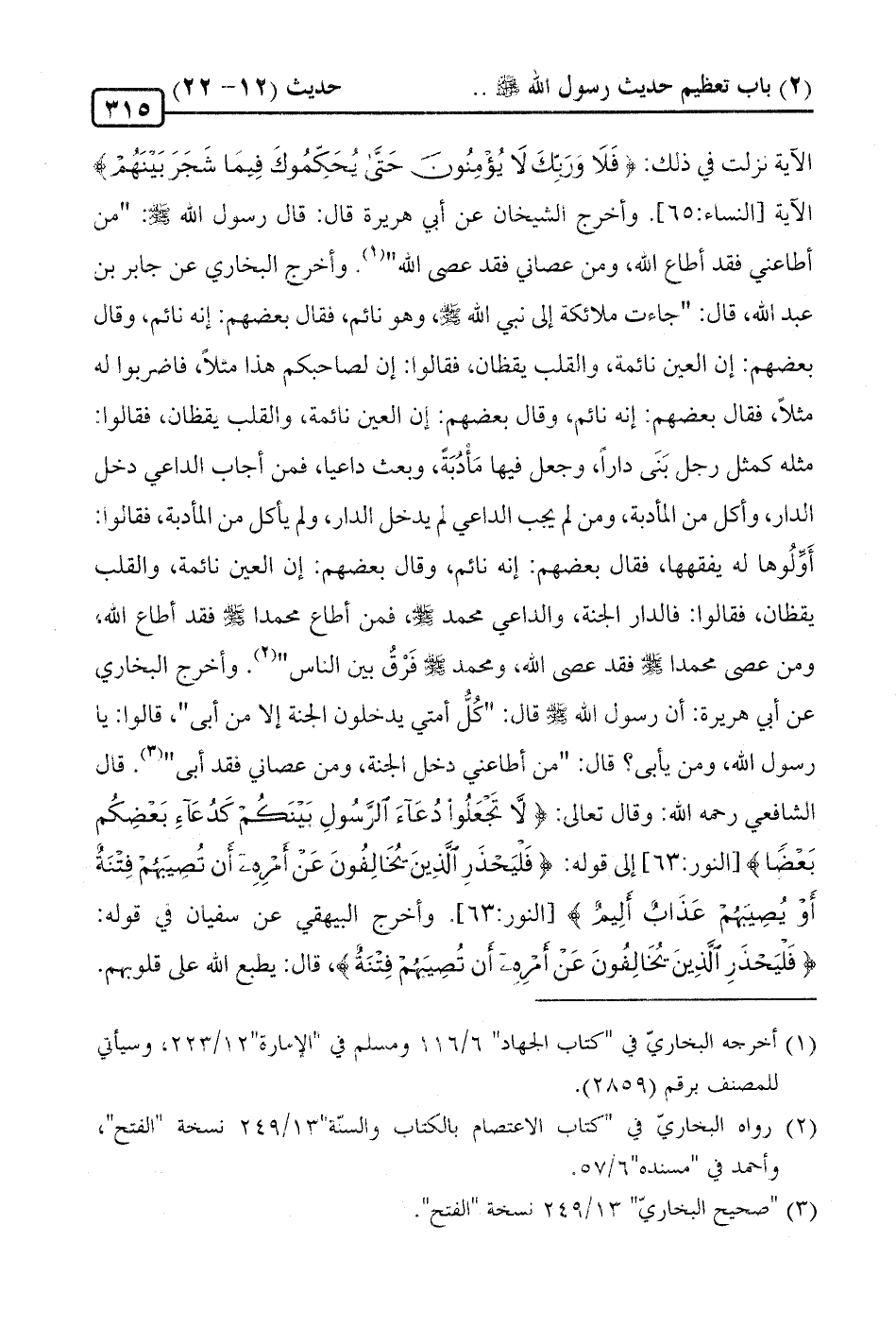 الآية نزلت في ذلك: {فَلَا وَرَبِّكَ لَا يُؤْمِنُونَ حَتَّى يُحَكِّمُوكَ فِيمَا شَجَرَ بَيْنَهُمْ} الآية [النساء: 65]. وأخرج الشيخان عن أبي هريرة قال: قال رسول الله -صلى الله عليه وسلم-: "من أطاعني فقد أطاع الله، ومن عصاني فقد عصى الله (¬1). وأخرج البخاري عن جابر بن عبد الله، قال: "جاءت ملائكة إلى نبي الله -صلى الله عليه وسلم-، وهو نائم، فقال بعضهم: إنه نائم، وقال بعضهم: إن العين نائمة، والقلب يقظان، فقالوا: إن لصاحبكم هذا مثلًا، فاضربوا له مثلًا، فقال بعضهم: إنه نائم، وقال بعضهم: إن العين نائمة، والقلب يقظان، فقالوا: مثله كمثل رجل بَنَى دارًا، وجعل فيها مَأْدبَةً، وبعث داعيا، فمن أجاب الداعي دخل الدار، وأكل من المأدبة، ومن لم يجب الداعي لم يدخل الدار، ولم يأكل من المأدبة، فقالوا: أَوِّلُوها له يفقهها، فقال بعضهم: إنه نائم، وقال بعضهم: إن العين نائمة، والقلب يقظان، فقالوا: فالدار الجنة، والداعي محمد -صلى الله عليه وسلم-، فمن أطاع محمدا -صلى الله عليه وسلم- فقد أطاع الله، ومن عصى محمدا -صلى الله عليه وسلم- فقد عصى الله، ومحمد -صلى الله عليه وسلم- فَرْقُ بين الناس" (¬2). وأخرج البخاري عن أبي هريرة: أن رسول الله -صلى الله عليه وسلم- قال: "كُلُّ أمتي يدخلون الجنة إلا من أبي"، قالوا: يا رسول الله، ومن يأبى؟ قال: "من أطاعني دخل الجنة، ومن عصانى فقد أبي" (¬3). قال الشافعي رحمه الله: وقال تعالى {لَا تَجْعَلُوا دُعَاءَ الرَّسُولِ بَيْنَكُمْ كَدُعَاءِ بَعْضِكُمْ بَعْضًا} [النور: 63] إلى قوله: {فَلْيَحْذَرِ الَّذِينَ يُخَالِفُونَ عَنْ أَمْرِهِ أَنْ تُصِيبَهُمْ فِتْنَةٌ أَوْ يُصِيبَهُمْ عَذَابٌ أَلِيمٌ} [النور: 63]. وأخرج البيهقي عن سفيان في قوله: {فَلْيَحْذَرِ الَّذِينَ يُخَالِفُونَ عَنْ أَمْرِهِ أَنْ تُصِيبَهُمْ فِتْنَة}، قال: يطبع الله على قلوبهم،