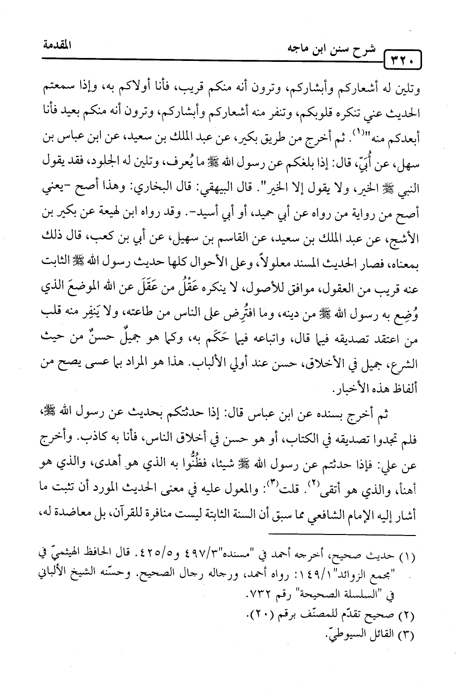 ثم أخرج بسنده عن ابن عباس قال: إذا حدثتكم بحديث عن رسول الله -صلى الله عليه وسلم-، فلم تجدوا تصديقه في الكتاب، أو هو حسن في أخلاق الناس، فأنا به كاذب. وأخرج عن علي: فإذا حدثتم عن رسول الله -صلى الله عليه وسلم- شيئا، فظُنُّوا به الذي هو أهدى، والذي هو أهنأ، والذي هو أتقى (¬2). قلت (¬3): والمعول عليه في معنى الحديث المورد أن تثبت ما أشار إليه الإمام الشافعي مما سبق أن السنة الثابتة ليست منافرة للقرآن، بل معاضدة له،