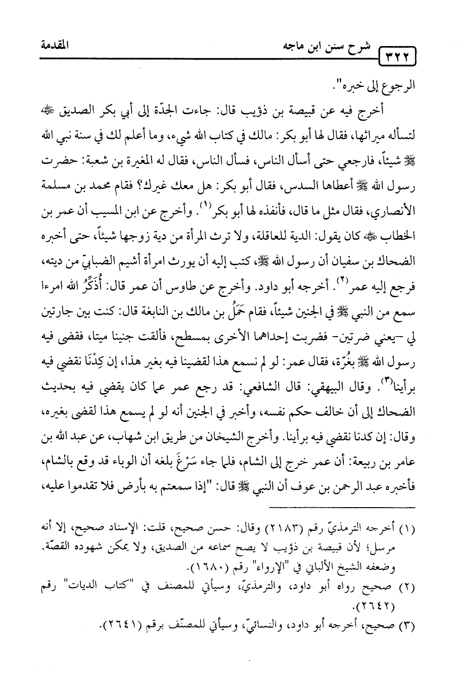 أخرج فيه عن قبيصة بن ذؤيب قال: جاءت الجدّة إلى أبي بكر الصديق -رضي الله عنه- لتسأله ميراثها، فقال لها أبو بكر: ما لك في كتاب الله شيء، وما أعلم لك في سنة نبي الله -صلى الله عليه وسلم- شيئًا، فارجعي حتى أسأل الناس، فسأل الناس، فقال له المغيرة بن شعبة: حضرت رسول الله -صلى الله عليه وسلم- أعطاها السدس، فقال أبو بكر: هل معك غيرك؟ فقام محمد بن مسلمة الأنصاري، فقال مثل ما قال، فأنفذه لها أبو بكر (¬1). وأخرج عن ابن المسيب أن عمر بن الخطاب -رضي الله عنه- كان يقول: الدية للعاقلة، ولا ترث المرأة من دية زوجها شيئًا، حتى أخبره الضحاك بن سفيان أن رسول الله -صلى الله عليه وسلم-، كتب إليه أن يورث امرأة أشيم الضبابيّ من ديته، فرجع إليه عمر (¬2). أخرجه أبو داود. وأخرج عن طاوس أن عمر قال: أُذَكِّرُ الله امرءا سمع من النبي -صلى الله عليه وسلم- في الجنين شيئًا، فقام حَمَلُ بن مالك بن النابغة قال: كنت بين جارتين لي -يعني ضرتين- فضربت إحداهما الأخرى بمسطح، فألقت جنينا ميتا، فقضى فيه رسول الله -صلى الله عليه وسلم- بغُرّة، فقال عمر: لو لم نسمع هذا لقضينا فيه بغير هذا، إن كِدْنَا نقضي فيه برأينا (¬3). وقال البيهقي: قال الشافعي: قد رجع عمر عما كان يقضي فيه بحديث الضحاك إلى أن خالف حكم نفسه، وأخبر في الجنين أنه لو لم يسمع هذا لقضى بغيره، وقال: إن كدنا نقضي فيه برأينا. وأخرج الشيخان من طريق ابن شهاب، عن عبد الله بن عامر بن ربيعة: أن عمر خرج إلى الشام، فلما جاء سَرْغَ بلغه أن الوباء قد وقع بالشام، فأخبره عبد الرحمن بن عوف أن النبي -صلى الله عليه وسلم- قال: "إذا سمعتم به بأرض فلا تقدموا عليه،