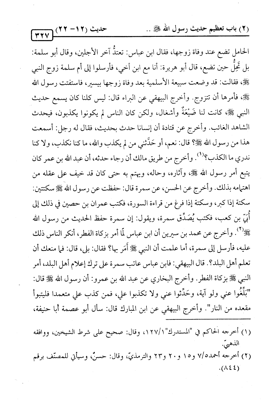 الحامل تضع عند وفاة زوجها، فقال ابن عباس: تعتدُّ آخر الأجلين، وقال أبو سلمة: بل تَحِلُّ حين تضع، قال أبو هريرة: أنا مع ابن أخي، فأرسلوا إلى أم سلمة زوج النبي -صلى الله عليه وسلم-، فقالت: قد وضعت سبيعة الأسلمية بعد وفاة زوجها بيسير، فاستفتت رسول الله -صلى الله عليه وسلم-، فأمرها أن تتزوج. وأخرج البيهقي عن البراء قال: ليس كلنا كان يسمع حديث النبي -صلى الله عليه وسلم-، كانت لنا ضَيْعَةٌ وأشغال، ولكن كان الناس لم يكونوا يكذبون، فيحدث الشاهد الغائب. وأخرج عن قتادة أن إنسانا حدث بحديث، فقال له رجل: أسمعت هذا من رسول الله -صلى الله عليه وسلم-؟ قال: نعم، أو حَدَّثني من لم يكذب والله، ما كنا نكذب، ولا كنا ندري ما الكذب؟ (¬1). وأخرج من طريق مالك أن رجاء حدثه، أن عبد الله بن عمر كان يتبع أمر رسول الله -صلى الله عليه وسلم-، وآثاره، وحاله، ويهتم به حتى كان قد خيف على عقله من اهتمامه بذلك. وأخرج عن الحسن، عن سمرة قال: حفظت عن رسول الله -صلى الله عليه وسلم- سكتتين: سكتة إذا كبر، وسكتة إذا فرغ من قراءة السورة، فكتب عمران بن حصين في ذلك إلى أُبيّ بن كعب، فكتب يُصَدِّق سمرة، ويقول: إن سمرة حفظ الحديث من رسول الله -صلى الله عليه وسلم- (¬2). وأخرج عن محمد بن سيرين أن ابن عباس لمّا أمر بزكاة الفطر، أنكر الناس ذلك عليه، فأرسل إلى سمرة، أما علمت أن النبي -صلى الله عليه وسلم- أَمَر بها؟ فقال: بلى، قال: فما منعك أن تعلم أهل البلد؟. قال البيهقي: فابن عباس عاتب سمرة على ترك إعلام أهل البلد، أمر النبي -صلى الله عليه وسلم- بزكاة الفطر. وأخرج البخاري عن عبد الله بن عمرو: أن رسول الله -صلى الله عليه وسلم- قال: "بَلِّغُوا عني ولو آية، وحَدِّثوا عني ولا تكذبوا علي، فمن كذب علي متعمدا فليتبوأ مقعده من النار". وأخرج البيهقي عن ابن المبارك قال: سأل أبو عصمة أبا حنيفة،