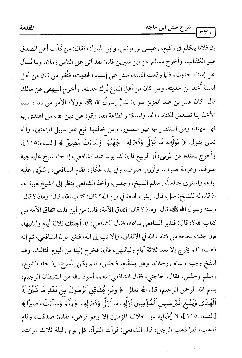 إن فلانا يتكلم في وكيع، وعيسى بن يونس، وابن المبارك، فقال: من كَذّب أهل الصدق فهو الكذاب. وأخرج مسلم عن ابن سيرين قال: لقد أتى على الناس زمان، وما يُسأل عن إسناد حديث، فلما وقعت الفتنة، سئل عن إسناد الحديث، فنُظر من كان من أهل السنة أُخذ من حديثه، ومن كان من أهل البدع تُرك حديثه. وأخرج البيهقي عن مالك قال: كان عمر بن عبد العزيز يقول: سَنَّ رسولُ الله -صلى الله عليه وسلم-، وولاة الأمر من بعده سننا الآخذ بها تصديق كتاب الله، واستكثار لطاعة الله، وقوة على دين الله، من اهتدى بها فهو مهتد، ومن استنصر بها فهو منصور، ومن خالفها اتبع غير سبيل المؤمنين، والله تعالى يقول: {نُوَلِّهِ مَا تَوَلَّى وَنُصْلِهِ جَهَنَّمَ وَسَاءَتْ مَصِيرًا} [النساء: 115]. وأخرج بسنده عن المزنى، أو الربيع قال: كنا يوما عند الشافعي، إذ جاء شيخ عليه جبة صوف، وعمامة صوف، وأزرار صوف، وفي يده عُكّاز، فقام الشافعي، وسَوّى عليه ثيابه، واستوى جالسًا، وسلم الشيخ، وجلس، وأخذ الشافعي ينظر إلى الشيخ هيبة له، إذ قال له للشيخ: سل، قال: إيش الحجة في دين الله؟ قال: كتاب الله، قال: وماذا؟ قال: وسنة رسول الله -صلى الله عليه وسلم-، قال: وماذا؟ قال: اتفاق الأمة، قال: من أين قلت اتفاق الأمة من كتاب الله؟، قال: فتدبر الشافعي ساعة، فقال للشافعي: قد أجلتك ثلاثة أيام ولياليها، فإن جئت بحجة من كتاب الله في الاتفاق، وإلا تب إلى الله، فتغير لون الشافعي، ثم إنه ذهب، فلم يخرج إلا بعد ثلاثة أيام ولياليهن، قال: فخرج إلينا من اليوم الثالث، وقد انتفخ وجهه ويداه ورجلاه، وهو مِسْتقَام، فجلس، فلم يكن بأسرع، إذ جاء الشيخ، وسلم وجلس، فقال: حاجتي، فقال الشافعي: نعم، أعوذ بالله من الشيطان الرجيم، بِسْمِ اللَّهِ الرَّحْمَنِ الرَّحِيمِ، قال الله تعالى: {وَمَنْ يُشَاقِقِ الرَّسُولَ مِنْ بَعْدِ مَا تَبَيَّنَ لَهُ الْهُدَى وَيَتَّبِعْ غَيْرَ سَبِيلِ الْمُؤْمِنِينَ نُوَلِّهِ مَا تَوَلَّى وَنُصْلِهِ جَهَنَّمَ وَسَاءَتْ مَصِيرًا} [النساء: 115]، لا يُصلِيه على خلاف المؤمنين إلا وهو فرض، فقال: صدقت، وقام فذهب، فلما ذهب الرجل، قال الشافعي: قرأت القرآن كل يوم وليلة ثلاث مرات،