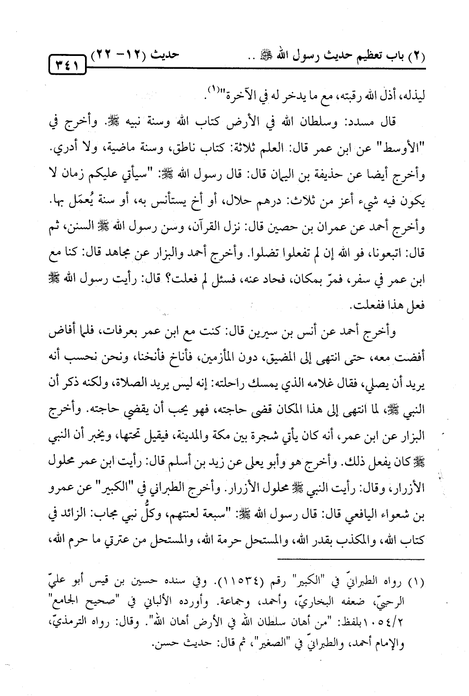 قال مسدد: وسلطان الله في الأرض كتاب الله وسنة نبيه -صلى الله عليه وسلم-. وأخرج في "الأوسط" عن ابن عمر قال: العلم ثلاثة: كتاب ناطق، وسنة ماضية، ولا أدري. وأخرج أيضا عن حذيفة بن اليمان قال: قال رسول الله -صلى الله عليه وسلم-: "سيأتي عليكم زمان لا يكون فيه شيء أعز من ثلاث: درهم حلال، أو أخ يستأنس به، أو سنة يُعمَل بها. وأخرج أحمد عن عمران بن حصين قال: نزل القرآن، وسن رسول الله -صلى الله عليه وسلم- السنن، ثم قال: اتبعونا، فوالله إن لم تفعلوا تضلوا. وأخرج أحمد والبزار عن مجاهد قال: كنا مع ابن عمر في سفر، فمرّ بمكان، فحاد عنه، فسئل لم فعلت؟ قال: رأيت رسول الله -صلى الله عليه وسلم- فعل هذا ففعلت.