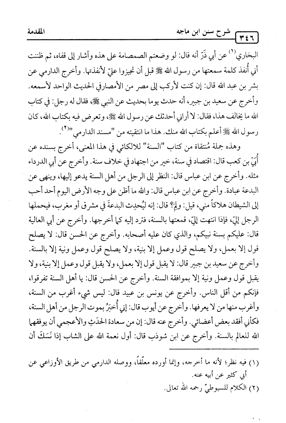 وهذه جملة منتقاه من كتاب "السنة" للالكائي في هذا المعنى، أخرج بسنده عن أُبيّ بن كعب قال: اقتصاد في سنة، خير من اجتهاد في خلاف سنة. وأخرج عن أبي الدرداء مثله. وأخرج عن ابن عباس قال: النظر إلى الرجل من أهل السنة يدعو إليها، وينهى عن البدعة عبادة. وأخرج عن ابن عباس قال: والله ما أظن على وجه الأرض اليوم أحد أحب إلى الشيطان هلاكًا مني، قيل: ولمَ؟ قال: إنه ليُحدِث البدعةَ في مشرق أو مغرب، فيحملها الرجل إليّ، فإذا انتهت إليّ، قمعتها بالسنة، فترد إليه كما أخرجها. وأخرج عن أبي العالية قال: عليكم بسنة نبيكم، والذي كان عليه أصحابه. وأخرج عن الحسن قال: لا يصلح قول إلا بعمل، ولا يصلح قول وعمل إلا بنية، ولا يصلح قول وعمل ونية إلا بالسنة. وأخرج عن سعيد بن جبير قال: لا يقبل قول إلا بعمل، ولا يقبل قول وعمل إلا بنية، ولا يقبل قول وعمل ونية إلا بموافقة السنة. وأخرج عن الحسن قال: يا أهل السنة تفرقوا، فإنكم من أقل الناس. وأخرج عن يونس بن عبيد قال: ليس شيء أغرب من السنة، وأغرب منها من لا يعرفها. وأخرج عن أيوب قال: إني أُخبَرُ بموت الرجل من أهل السنة، فكأني أفقد بعض أعضائي. وأخرج عنه قال: إن من سعادة الحدَث والأعجمي أن يوفقهما الله للعالم بالسنة. وأخرج عن ابن شوذب قال: أول نعمة الله على الشاب إذا نَسَكَ أن