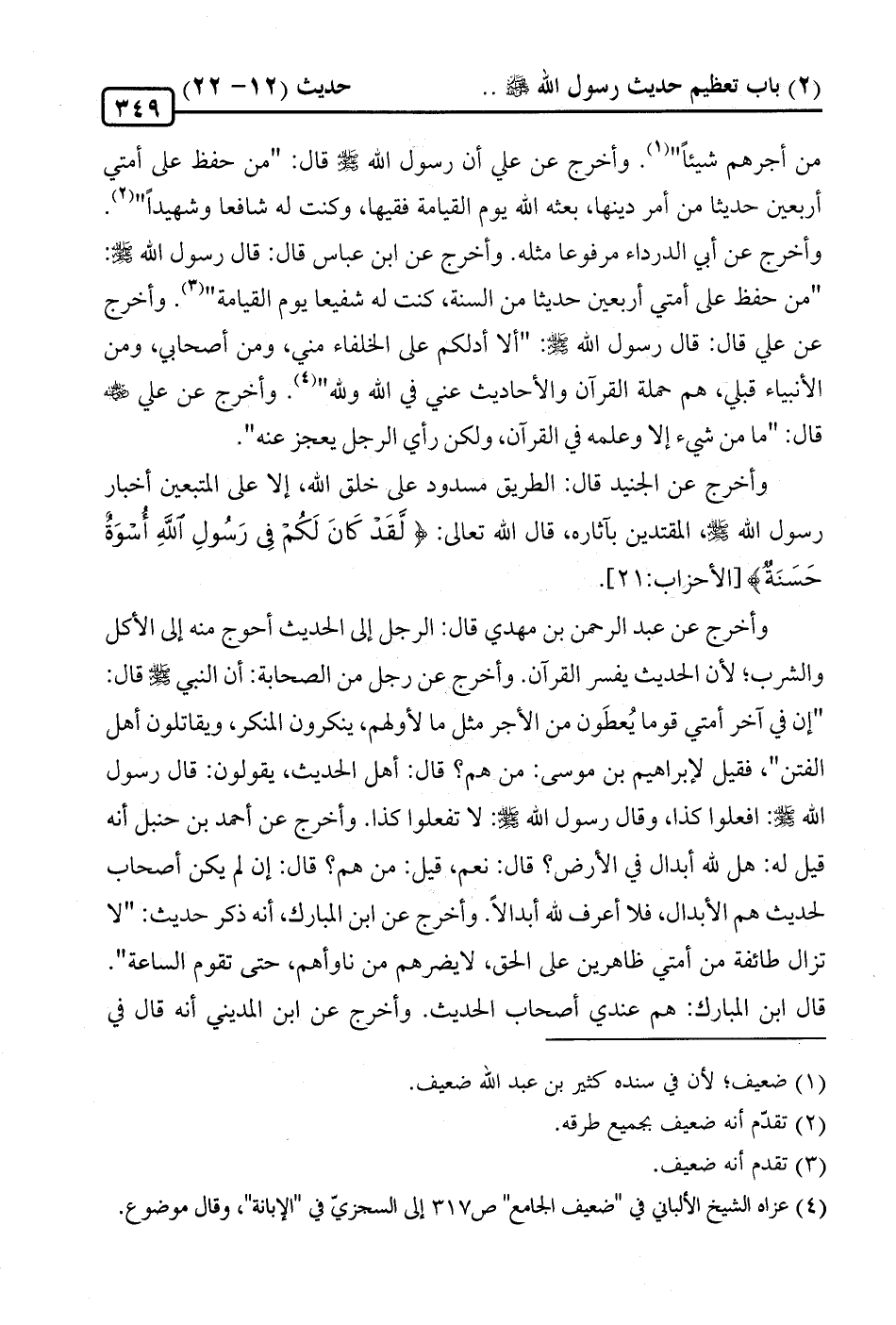 وأخرج عن عبد الرحمن بن مهدي قال: الرجل إلى الحديث أحوج منه إلى الأكل والشرب؛ لأن الحديث يفسر القرآن. وأخرج عن رجل من الصحابة: أن النبي -صلى الله عليه وسلم- قال: "إن في آخر أمتي قوما يُعطَون من الأجر مثل ما لأولهم، ينكرون المنكر، ويقاتلون أهل الفتن"، فقيل لإبراهيم بن موسى: من هم؟ قال: أهل الحديث، يقولون: قال رسول الله -صلى الله عليه وسلم-: افعلوا كذا، وقال رسول الله -صلى الله عليه وسلم-: لا تفعلوا كذا. وأخرج عن أحمد بن حنبل أنه قيل له: هل لله أبدال في الأرض؟ قال: نعم، قيل: من هم؟ قال: إن لم يكن أصحاب لحديث هم الأبدال، فلا أعرف لله أبدالًا. وأخرج عن ابن المبارك، أنه ذكر حديث: "لا تزال طائفة من أمتي ظاهرين على الحق، لا يضرهم من ناوأهم، حتى تقوم الساعة". قال ابن المبارك: هم عندي أصحاب الحديث. وأخرج عن ابن المديني أنه قال في