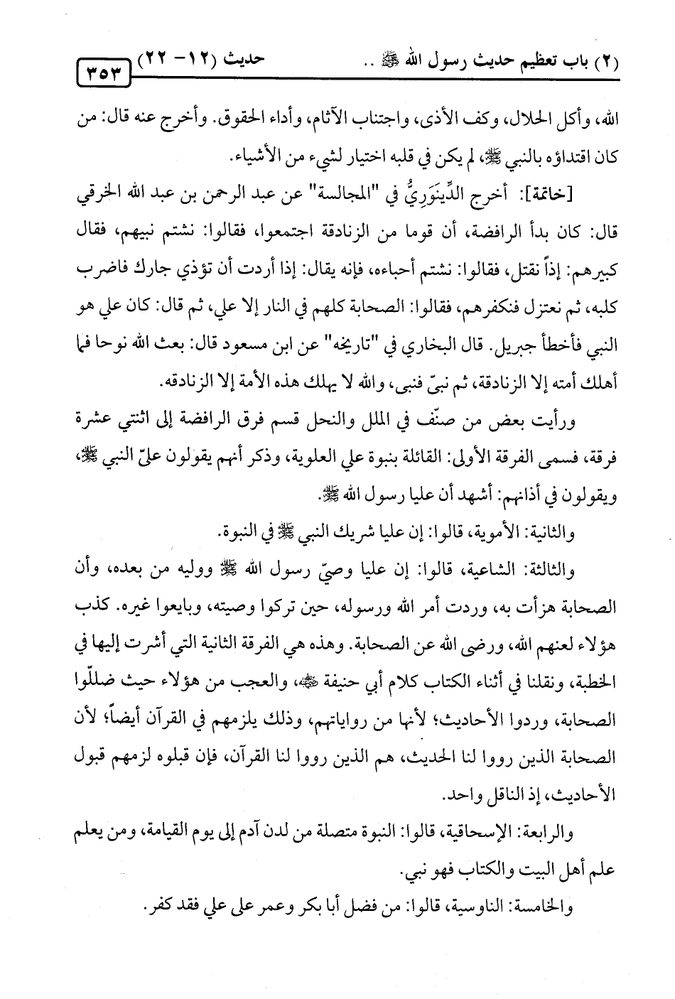 والثالثة: الشاعية، قالوا: إن عليا وصيّ رسول الله -صلى الله عليه وسلم- ووليه من بعده، وأن الصحابة هزأت به، وردت أمر الله ورسوله، حين تركوا وصيته، وبايعوا غيره. كذب هؤلاء لعنهم الله، ورضي الله عن الصحابة. وهذه هي الفرقة الثانية التي أشرت إليها في الخطبة، ونقلنا في أثناء الكتاب كلام أبي حنيفة -رضي الله عنه-، والعجب من هؤلاء حيث ضللّوا الصحابة، وردوا الأحاديث؛ لأنها من رواياتهم، وذلك يلزمهم في القرآن أيضًا؛ لأن الصحابة الذين رووا لنا الحديث، هم الذين رووا لنا القرآن، فإن قبلوه لزمهم قبول الأحاديث، إذ الناقل واحد.