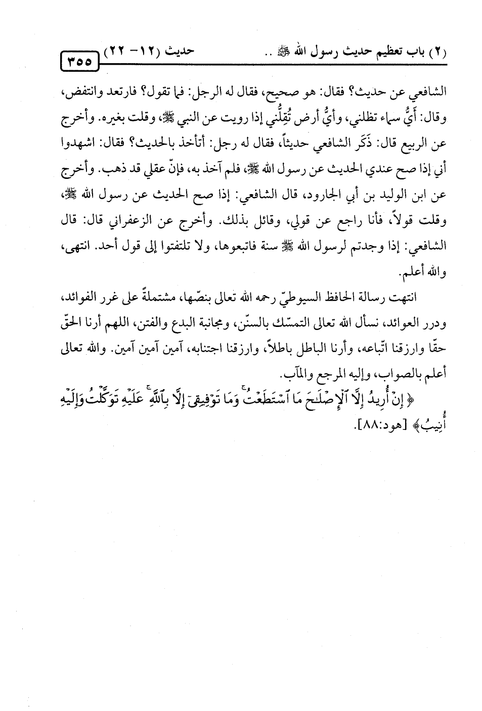 انتهت رسالة الحافظ السيوطيّ رحمه الله تعالى بنصّها، مشتملةً على غرر الفوائد، ودرر العوائد، نسأل الله تعالى التمسّك بالسنّن، ومجانبة البدع والفتن، اللهم أرنا الحقّ حقّا وارزقنا اتّباعه، وأرنا الباطل باطلًا، وارزقنا اجتنابه، آمين آمين آمين. والله تعالى أعلم بالصواب، وإليه المرجع والمآب.