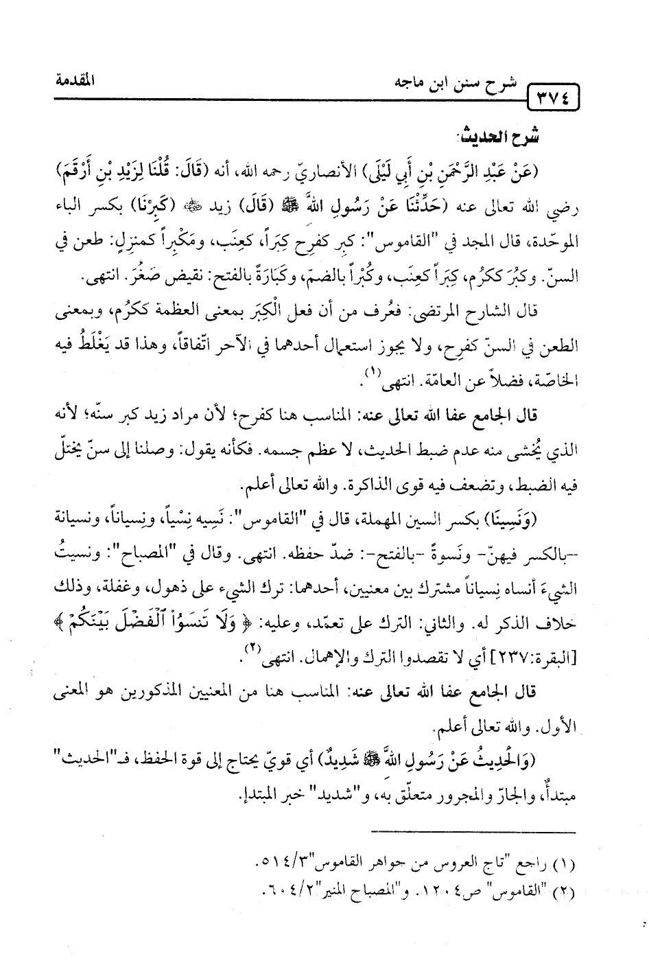 قال الجامع عفا الله تعالى عنه: المناسب هنا كفرح؛ لأن مراد زيد كبر سنّه؛ لأنه الذي يُخشى منه عدم ضبط الحديث، لا عظم جسمه. فكأنه يقول: وصلنا إلى سنّ يختلّ فيه الضبط، وتضعف فيه قوى الذاكرة. والله تعالى أعلم.