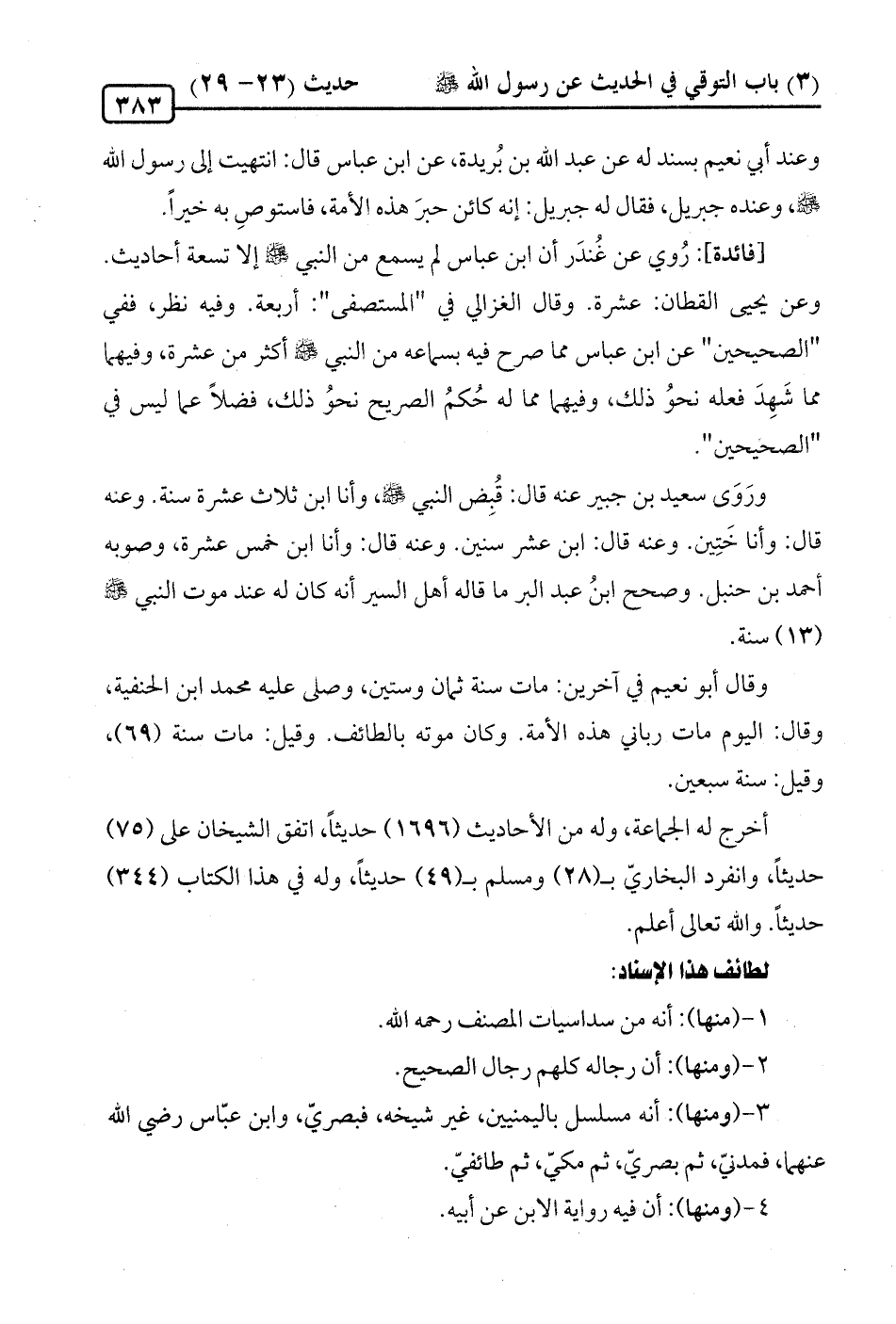 [فائدة]: رُوي عن غُندَر أن ابن عباس لم يسمع من النبي -صلى الله عليه وسلم- إلا تسعة أحاديث. وعن يحيى القطان: عشرة. وقال الغزالي في "المستصفى": أربعة. وفيه نظر، ففي "الصحيحين" عن ابن عباس مما صرح فيه بسماعه من النبي -صلى الله عليه وسلم- أكثر من عشرة، وفيهما مما شَهِدَ فعله نحوُ ذلك، وفيهما مما له حُكمُ الصريح نحوُ ذلك، فضلًا عما ليس في "الصحيحين".