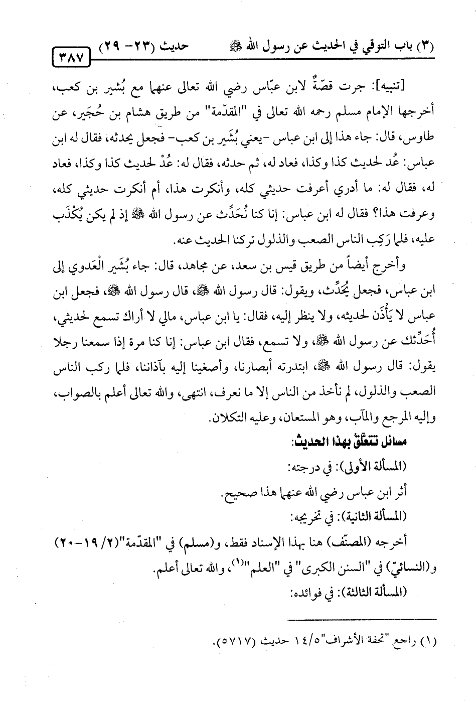 [تنبيه]: جرت قصّةٌ لابن عبّاس رضي الله تعالى عنهما مع بُشير بن كعب، أخرجها الإمام مسلم رحمه الله تعالى في "المقدّمة" من طريق هشام بن حُجَير، عن طاوس، قال: جاء هذا إلى ابن عباس -يعني بُشير بن كعب- فجعل يحدثه، فقال له ابن عباس: عُد لحديث كذا وكذا، فعاد له، ثم حدثه، فقال له: عُدْ لحديث كذا وكذا، فعاد له، فقال له: ما أدري أعرفت حديثي كله، وأنكرت هذا، أم أنكرت حديثي كله، وعرفت هذا؟ فقال له ابن عباس: إنا كنا نُحَدِّث عن رسول الله -صلى الله عليه وسلم- إذ لم يكن يُكْذَب عليه، فلما رَكِب الناس الصعب والذلول تركنا الحديث عنه.