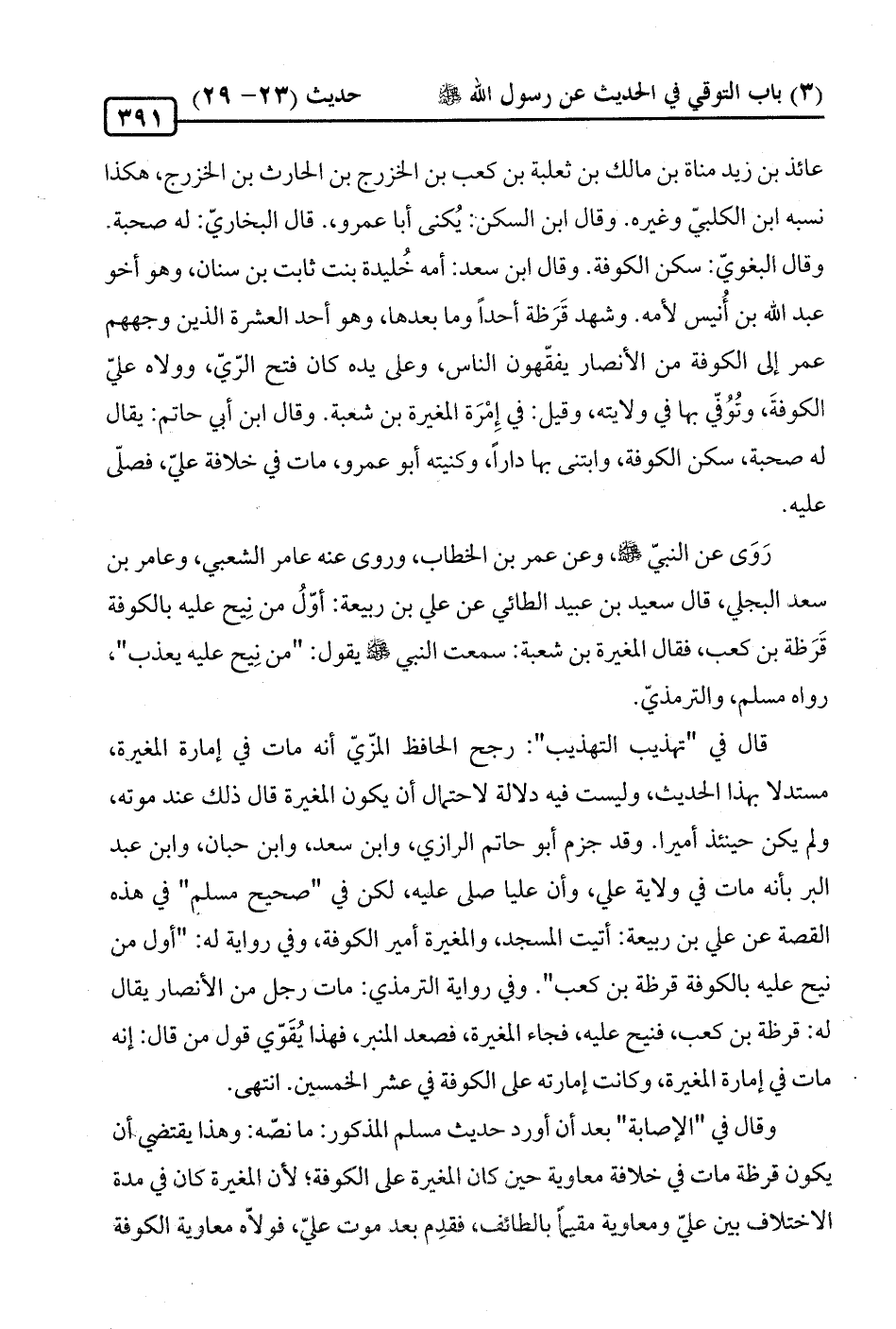 وقال في "الإصابة" بعد أن أورد حديث مسلم المذكور: ما نصّه: وهذا يقتضي أن يكون قرظة مات في خلافة معاوية حين كان المغيرة على الكوفة؛ لأن المغيرة كان في مدة الاختلاف بين عليّ ومعاوية مقيمًا بالطائف، فقدِم بعد موت عليّ، فولّاه معاوية الكوفة