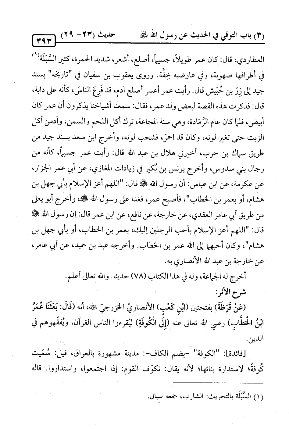 العطاردي، قال: كان عمر طويلًا، جسيمًا، أصلع، أشعر، شديد الحمرة، كثير السَّبَلَة (¬1) في أطرافها صهوبة، وفي عارضيه خِفَّة. وروى يعقوب بن سفيان في "تاريخه" بسند جيد إلى زِرّ بن حُبَيش قال: رأيت عمر أعسر أصلع آدم، قد فَرعَ الناسَ، كأنه على دابة، قال: فذكرت هذه القصة لبعض ولد عمر، فقال: سمعنا أشياخنا يذكرون أن عمر كان أبيض، فلما كان عام الرَّمَادة، وهي سنة المجاعة، ترك أكل اللحم والسمن، وأدمن أكل الزيت حتى تغير لونه، وكان قد احمرّ، فشحب لونه، وأخرج ابن سعد بسند جيد من طريق سماك بن حرب، أخبرني هلال بن عبد الله قال: رأيت عمر جسيمًا، كأنه من رجال بني سدوس، وأخرج يونس بن بُكير في زيادات المغازي، عن أبي عمر الجزار، عن عكرمة، عن ابن عباس: أن رسول الله -صلى الله عليه وسلم- قال: "اللهم أعز الإسلام بأبي جهل بن هشام، أو بعمر بن الخطاب"، فأصبح عمر، فغدا على رسول الله -صلى الله عليه وسلم-، وأخرج أبو يعلى من طريق أبي عامر العقدي، عن خارجة، عن نافع، عن ابن عمر قال: إن رسول الله -صلى الله عليه وسلم- قال: "اللهم أعز الإسلام بأحب الرجلين إليك، بعمر بن الخطاب، أو بأبي جهل بن هشام"، وكان أحبهما إلى الله عمر بن الخطاب. وأخرجه عبد بن حميد، عن أبي عامر، عن خارجة بن عبد الله الأنصاري به.